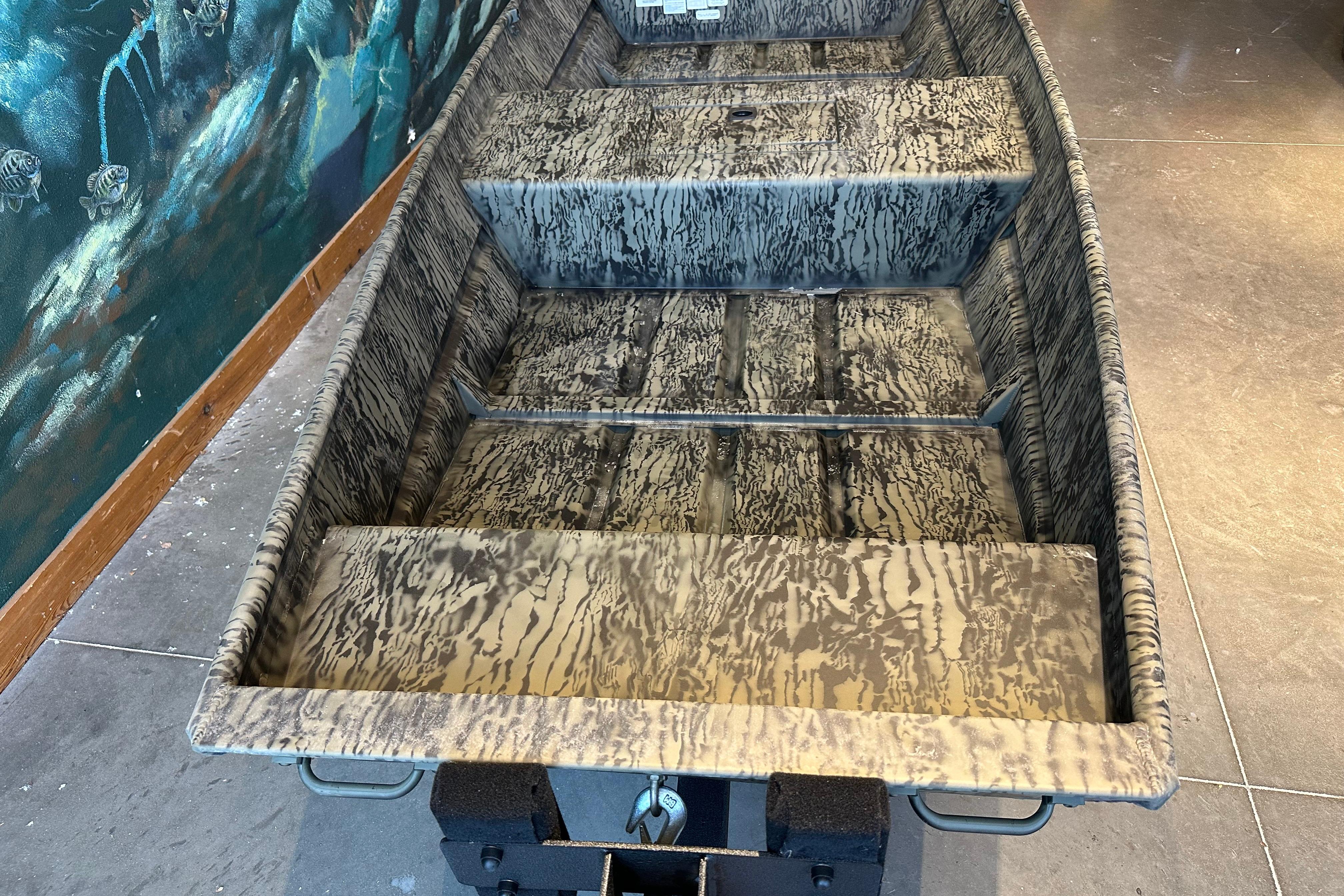The NEW TRACKER GRIZZLY 15 Jon is a rugged and versatile all-welded aluminum jon boat, suitable for fishing, hunting, or work purposes. Its unitized stringer, transom, and hull ensure a sturdy build and a smooth, dry ride. The boat features a thick .063 aluminum cockpit floor and a 9.5-gallon wet well on the front deck. This hull provides a comfortable ride, and the Forest Green powder-coat finish adds to its durability. Additionally, the TRACKER PROMISE warranty offers peace of mind, making it a reliable choice among aluminum boats.