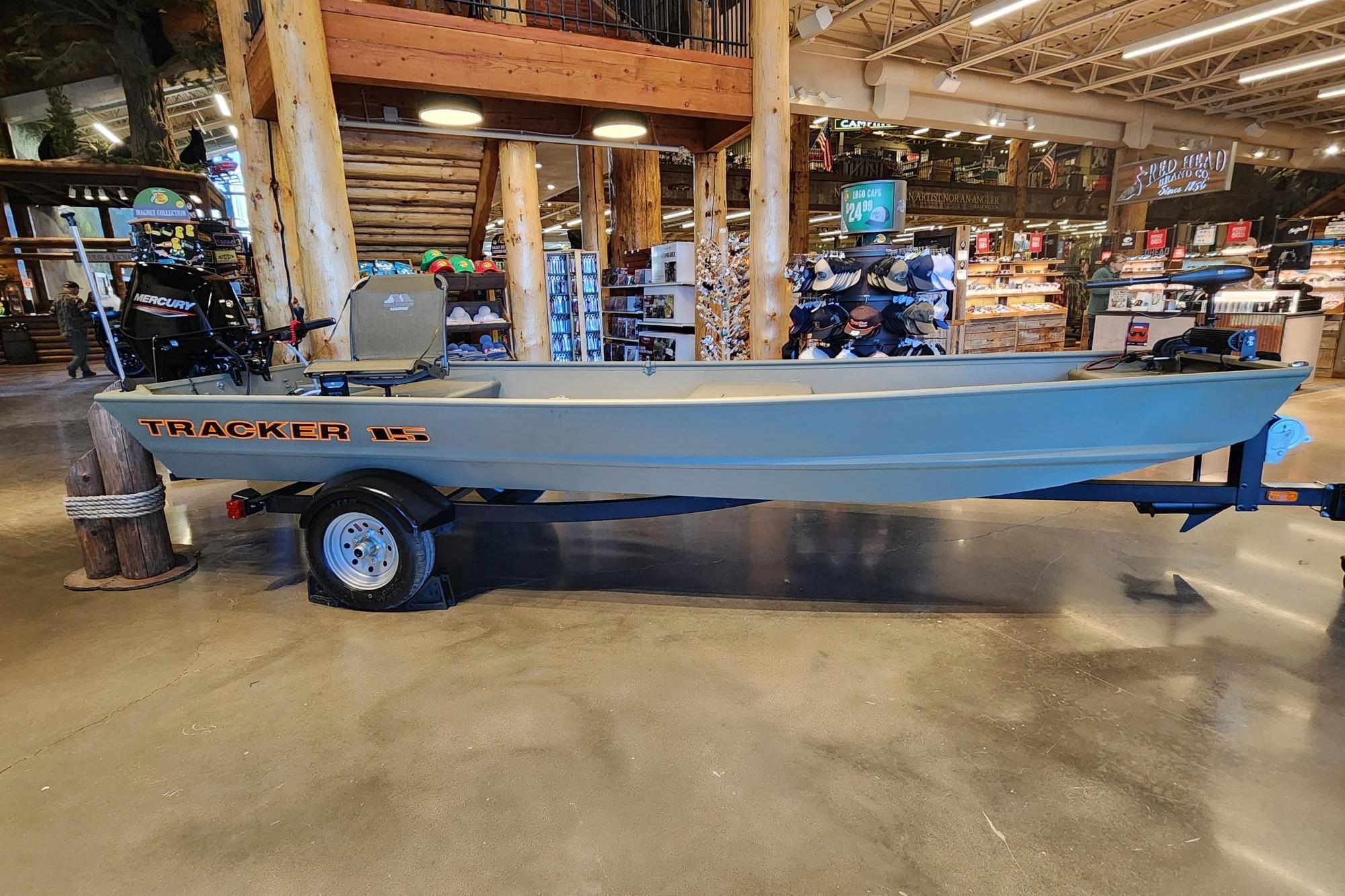 The NEW TRACKER GRIZZLY 15 Jon is a rugged and versatile all-welded aluminum jon boat, suitable for fishing, hunting, or work purposes. Its unitized stringer, transom, and hull ensure a sturdy build and a smooth, dry ride. The boat features a thick .063 aluminum cockpit floor and a 9.5-gallon wet well on the front deck. This hull provides a comfortable ride, and the Forest Green powder-coat finish adds to its durability. Additionally, the TRACKER PROMISE warranty offers peace of mind, making it a reliable choice among aluminum boats.