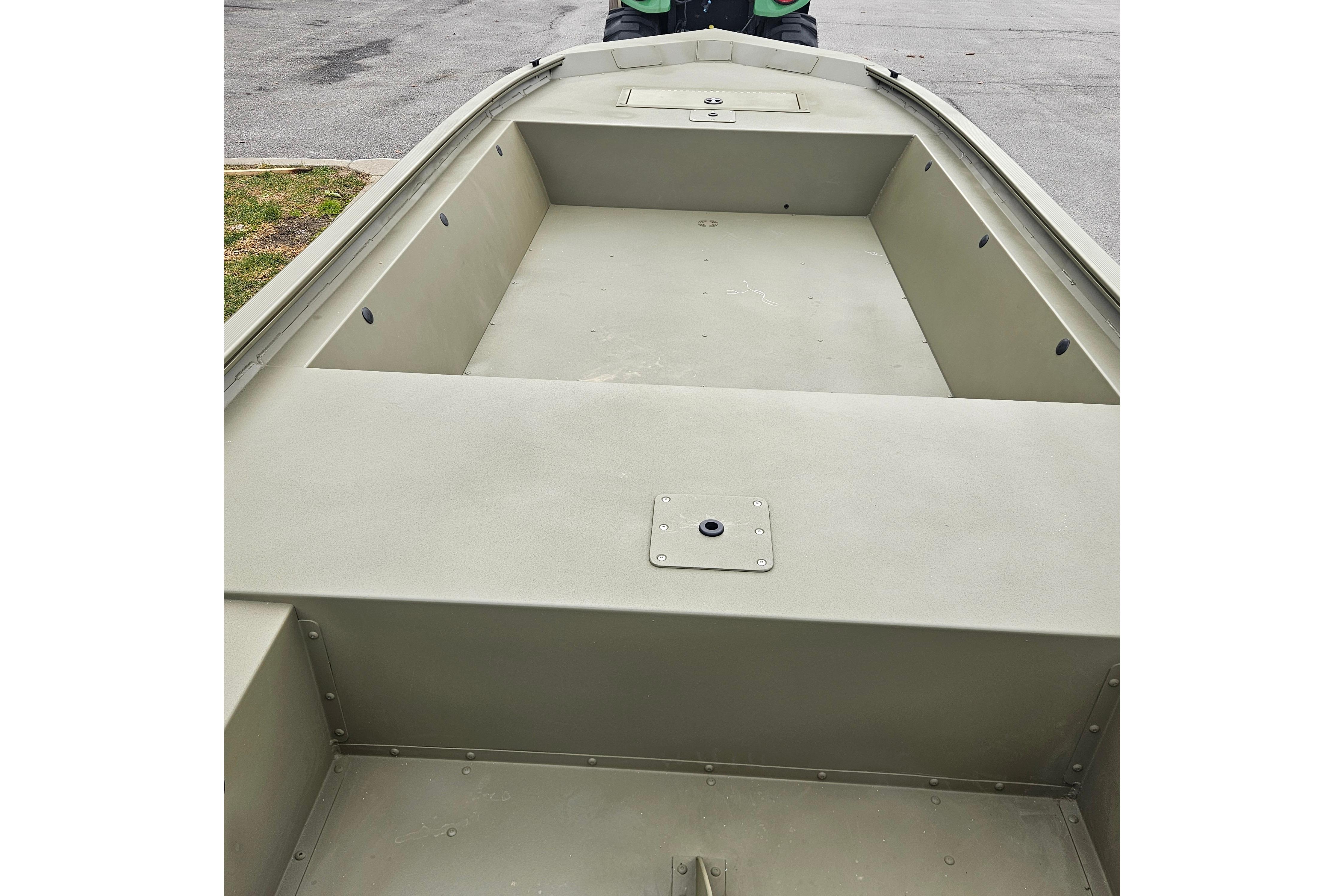 The all-welded TRACKER® GRIZZLY® 1648 Jon is a tough and versatile aluminum jon boat that can easily be adapted for fishing, hunting or working. The unitized stringer, transom and hull provide rock-solid construction and a smooth, dry ride. The 1648 has a thick .190 aluminum cockpit floor plus a big front deck with a lockable storage compartment. The 7° deadrise Mod V hull provides a smooth, dry ride, and it's finished with our exclusive Forest Green powder-coat (as well as SURE TREAD™ texture on the floor). And like all TRACKER boats, it’s backed by the TRACKER PROMISE—the best factory warranty in aluminum boats.