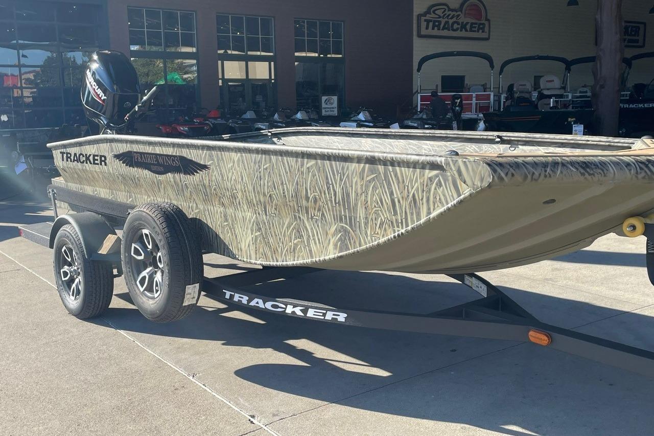 From rivers and bayous to lakes and brakes, the TRACKER 1650 T Prairie Wings Edition is custom-made to get you, your gear, and your buddies to those out-of-the-way honey holes that guarantee you’ll get your limit. A no-frills interior provides all the space you need to haul spreads, dog’s and your best friend while smooth, reliable, and stealthy Mercury® FourStroke power with an Icebreaker keel gets you there. The cockpit and decks are coated with Sure Tread™ flooring that offers superior grip in any conditions. Bow and stern pedestal seating locations offer versatility while hunting or when underway, and easy-to-reach switching offer simple, reliable control over the boat's functions. Outwardly, the TRACKER 1650 T Prairie Wings edition is covered in your choice of flat green or True Timber® camo finishes, and like all TRACKER boats, it’s made with 100% all-welded aluminum for maximum durability. Rear steps add an additional layer of convenience and safety, and VERSATRAK™ mounting channels let you add all manner of accessories for a truly customized killer tiller.