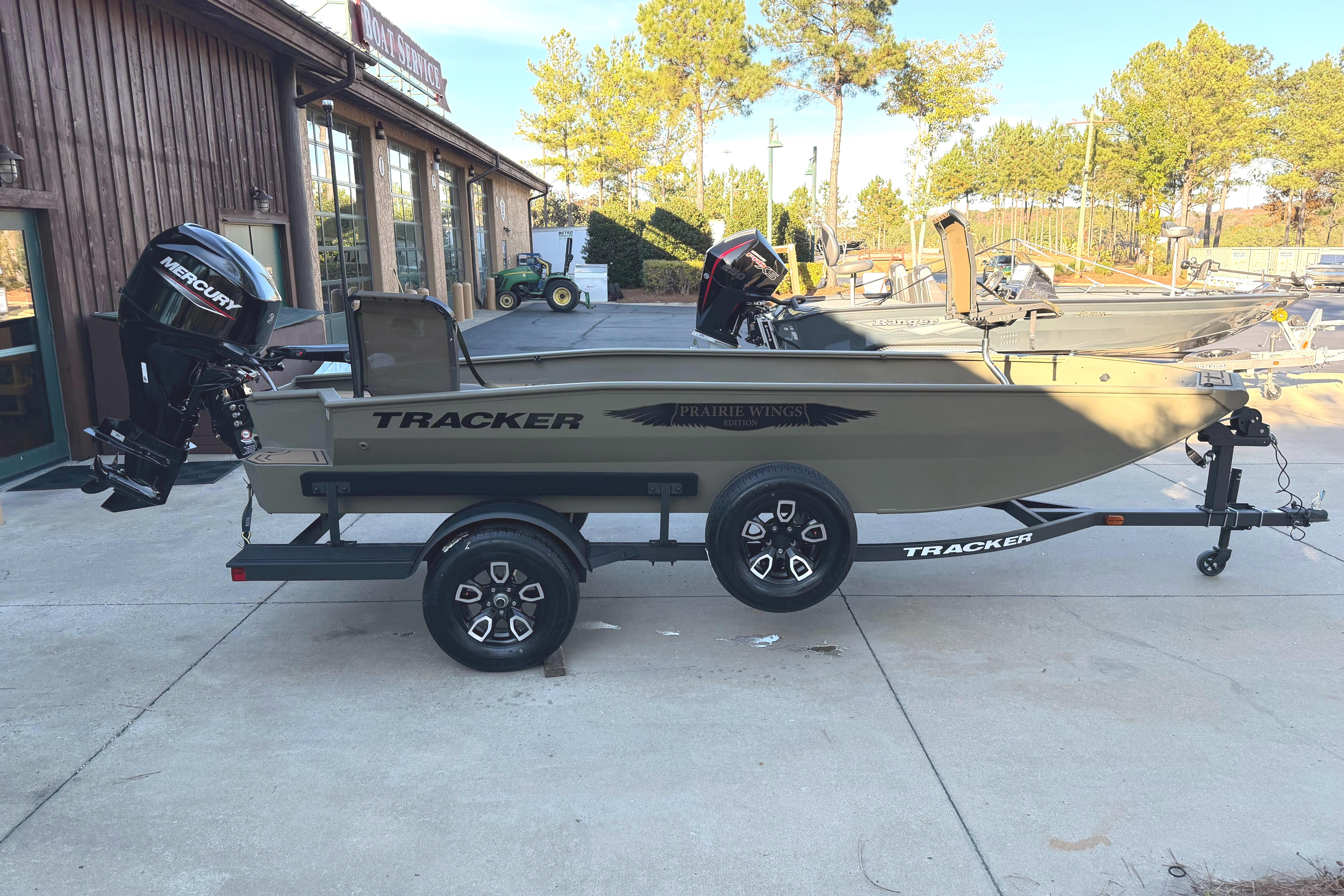 From rivers and bayous to lakes and brakes, the TRACKER 1650 T Prairie Wings Edition is custom-made to get you, your gear, and your buddies to those out-of-the-way honey holes that guarantee you’ll get your limit. A no-frills interior provides all the space you need to haul spreads, dog’s and your best friend while smooth, reliable, and stealthy Mercury® FourStroke power with an Icebreaker keel gets you there. The cockpit and decks are coated with Sure Tread™ flooring that offers superior grip in any conditions. Bow and stern pedestal seating locations offer versatility while hunting or when underway, and easy-to-reach switching offer simple, reliable control over the boat's functions. Outwardly, the TRACKER 1650 T Prairie Wings edition is covered in your choice of flat green or True Timber® camo finishes, and like all TRACKER boats, it’s made with 100% all-welded aluminum for maximum durability. Rear steps add an additional layer of convenience and safety, and VERSATRAK™ mounting channels let you add all manner of accessories for a truly customized killer tiller.