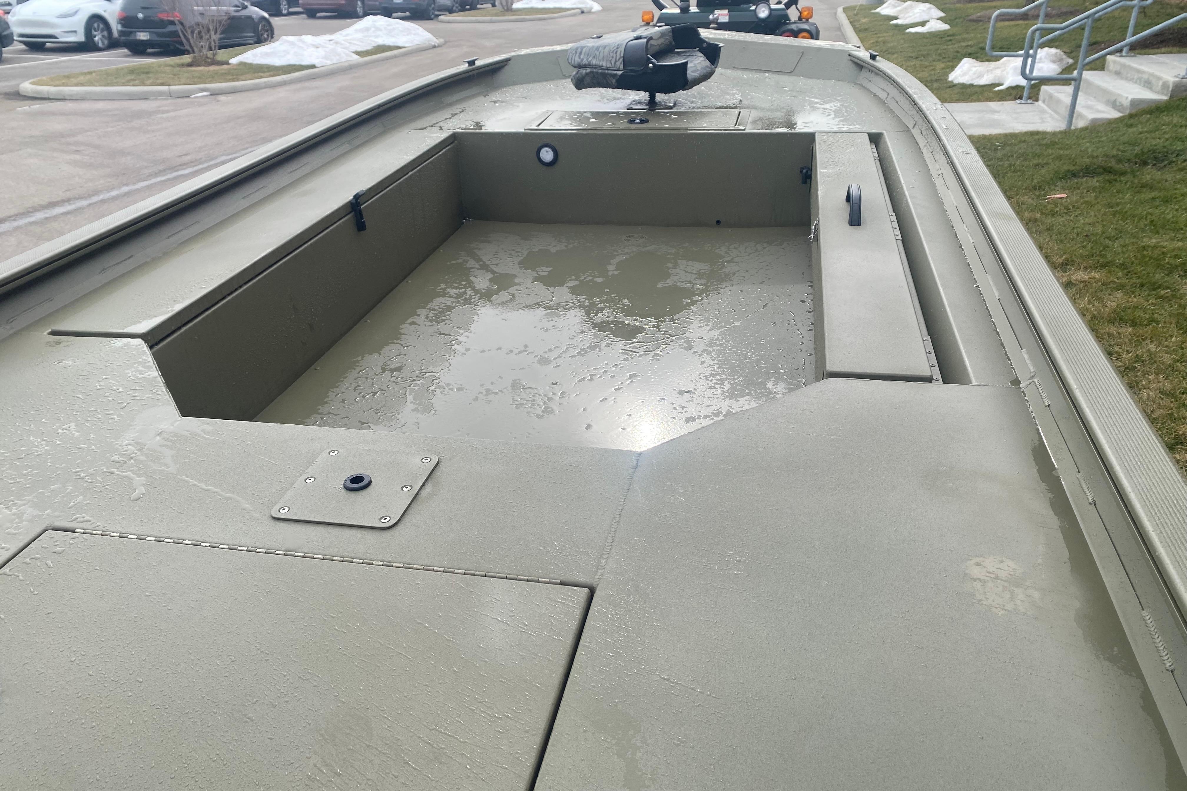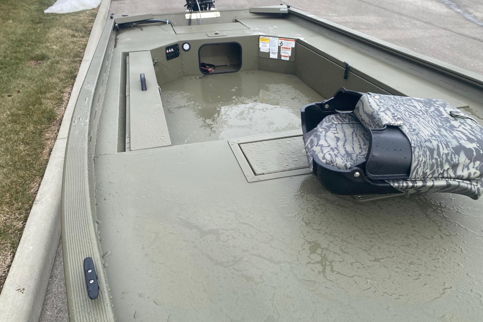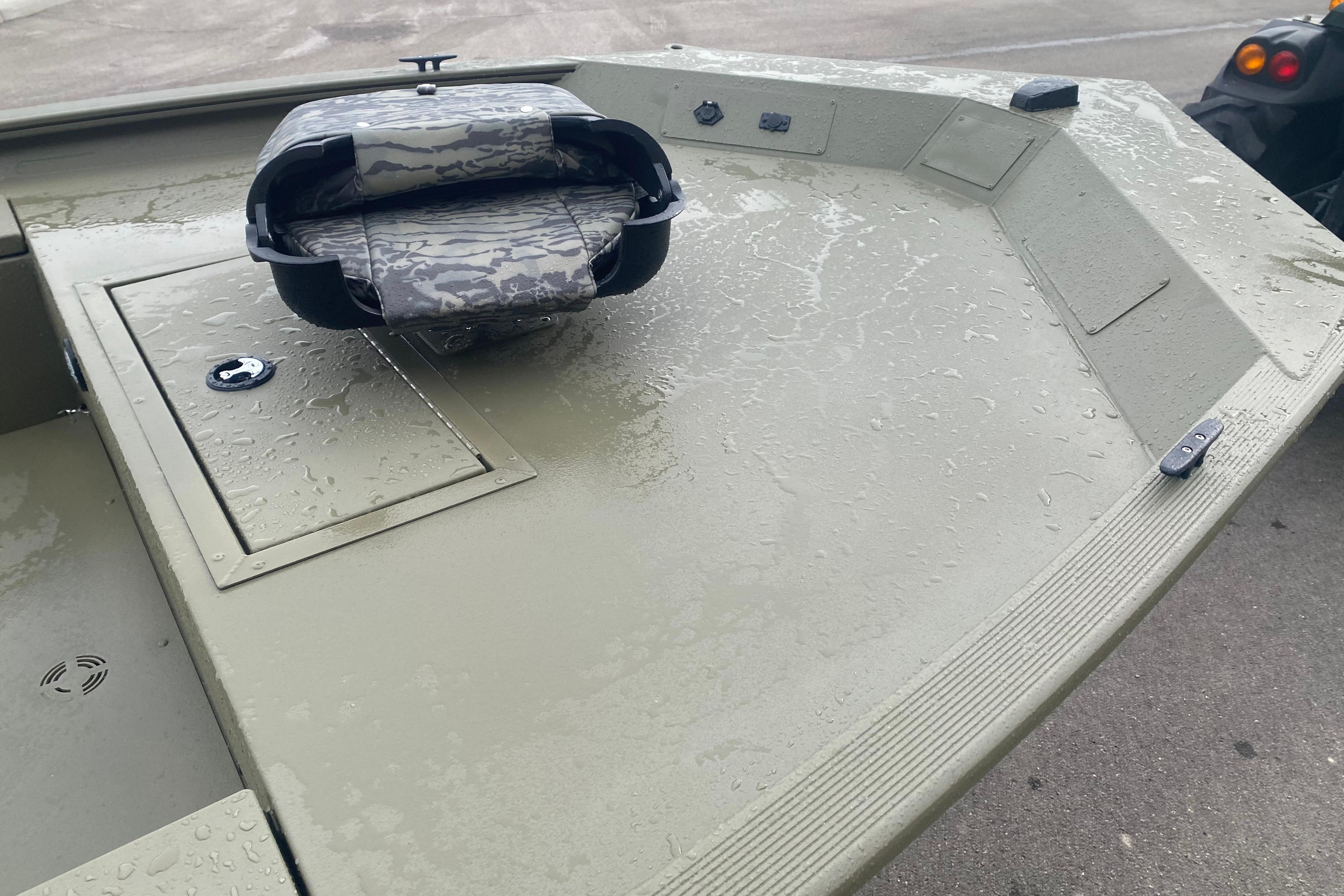 Meet the TRACKER® GRIZZLY® 1654 T Sportsman, a rugged and versatile duck-hunting vessel built to withstand the demands of waterfowling adventures. This specialized boat features an optimized layout, including a lockable bow deck storage compartment, a port rod/gear box, and a lockable, removable starboard gun box, providing the functionality and convenience essential for successful hunts on the water. The GRIZZLY 1654 T Sportsman is constructed with a unitized, all-welded stringer, transom, and Mod V hull, ensuring exceptional durability and a smooth, dry ride even in challenging conditions. The integrated transom sponsons further enhance the boat's performance in shallow waters, allowing you to navigate effortlessly through various terrains. Finished with our exclusive Forest Green powder-coat finish, this all-aluminum vessel exudes quality and resilience. Additionally, optional Grassland or Woodland camo patterns are available for those seeking a customized look to blend into their surroundings. Just like every GRIZZLY model, the 1654 T Sportsman is backed by the TRACKER PROMISE, providing you with the best factory warranty in the realm of aluminum boats. With its robust construction, specialized features, and reliable warranty, the GRIZZLY 1654 T Sportsman stands as the ultimate waterfowl-hunting machine, ready to elevate your hunting experiences on the water.