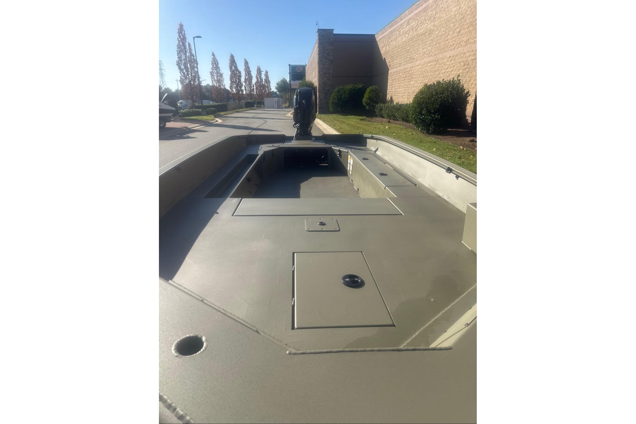 Designed for versatility, it features a spacious front deck ideal for duck hunting, multiple lockable storage compartments, and dry storage in the aft port seat pod. The interior includes Sure Tread™ non-skid flooring for safety and longevity, along with strategically placed tie-down points for gear security. The exclusive VERSATRACK® accessory channel allows customization. Constructed from 100% aluminum with a wood-free transom system, it provides a smooth, dry ride thanks to its 7° deadrise and icebreaker keel. Additional features include integrated spud pole tubes, rear transom steps, and a welded foam-filled interior for strength. Equipped with practical electrical components and a powder-coated trailer, this boat is perfect for die hard waterfowl hunters, and outdoor enthusiasts seeking durability and style in striking Forest Green or TrueTimber® camo patterns.