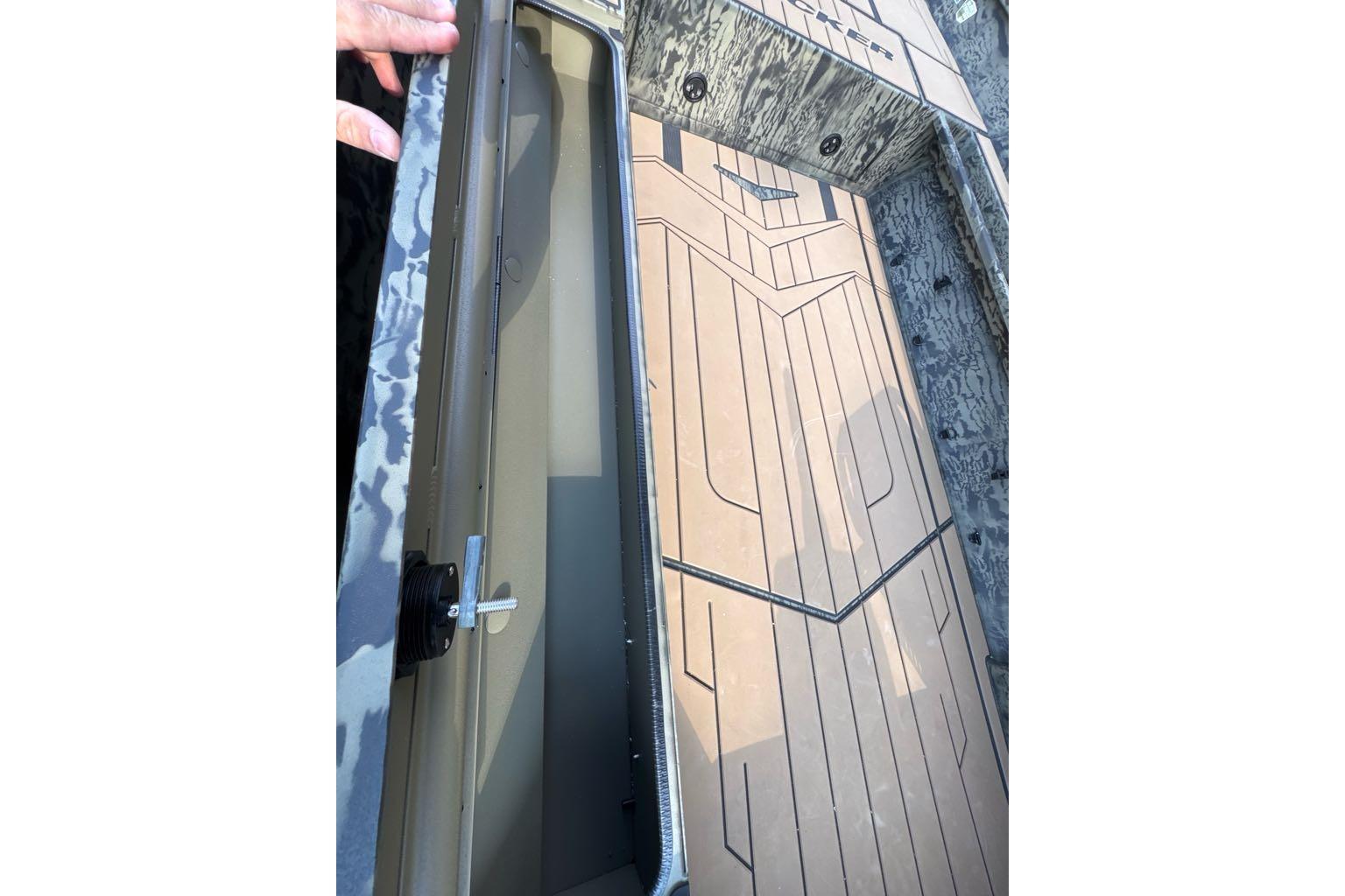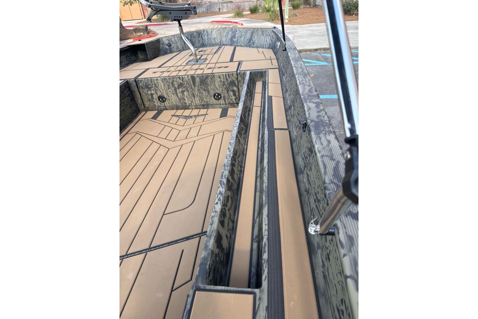Designed for versatility, it features a spacious front deck ideal for duck hunting, multiple lockable storage compartments, and dry storage in the aft port seat pod. The interior includes Sure Tread™ non-skid flooring for safety and longevity, along with strategically placed tie-down points for gear security. The exclusive VERSATRACK® accessory channel allows customization. Constructed from 100% aluminum with a wood-free transom system, it provides a smooth, dry ride thanks to its 7° deadrise and icebreaker keel. Additional features include integrated spud pole tubes, rear transom steps, and a welded foam-filled interior for strength. Equipped with practical electrical components and a powder-coated trailer, this boat is perfect for die hard waterfowl hunters, and outdoor enthusiasts seeking durability and style in striking Forest Green or TrueTimber® camo patterns.