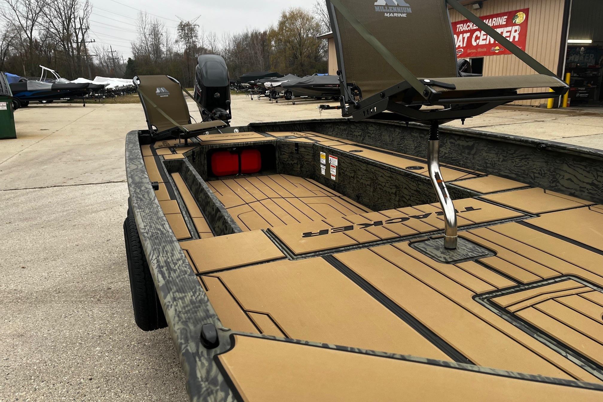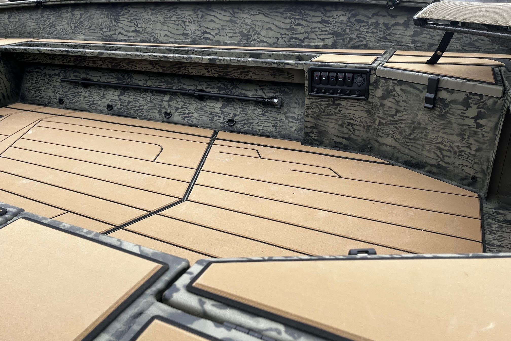 Designed for versatility, it features a spacious front deck ideal for duck hunting, multiple lockable storage compartments, and dry storage in the aft port seat pod. The interior includes Sure Tread™ non-skid flooring for safety and longevity, along with strategically placed tie-down points for gear security. The exclusive VERSATRACK® accessory channel allows customization. Constructed from 100% aluminum with a wood-free transom system, it provides a smooth, dry ride thanks to its 7° deadrise and icebreaker keel. Additional features include integrated spud pole tubes, rear transom steps, and a welded foam-filled interior for strength. Equipped with practical electrical components and a powder-coated trailer, this boat is perfect for die hard waterfowl hunters, and outdoor enthusiasts seeking durability and style in striking Forest Green or TrueTimber® camo patterns.
