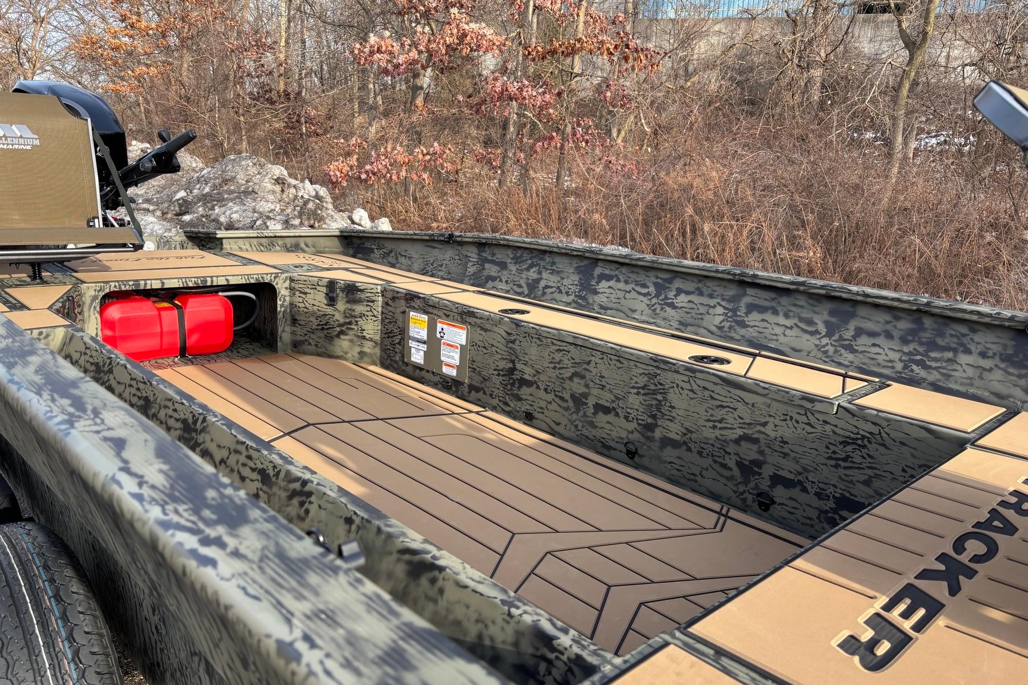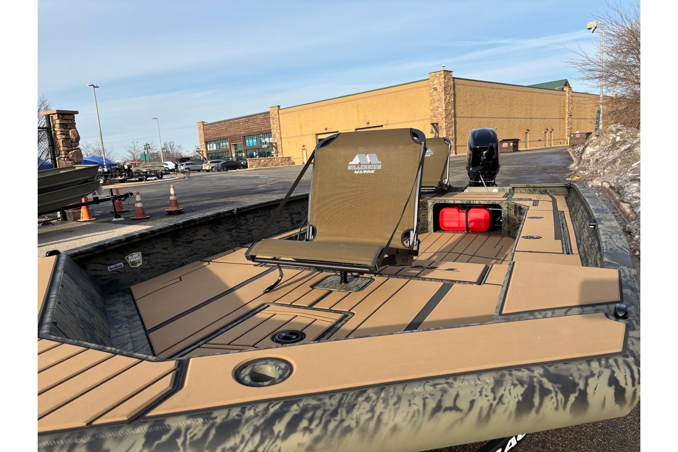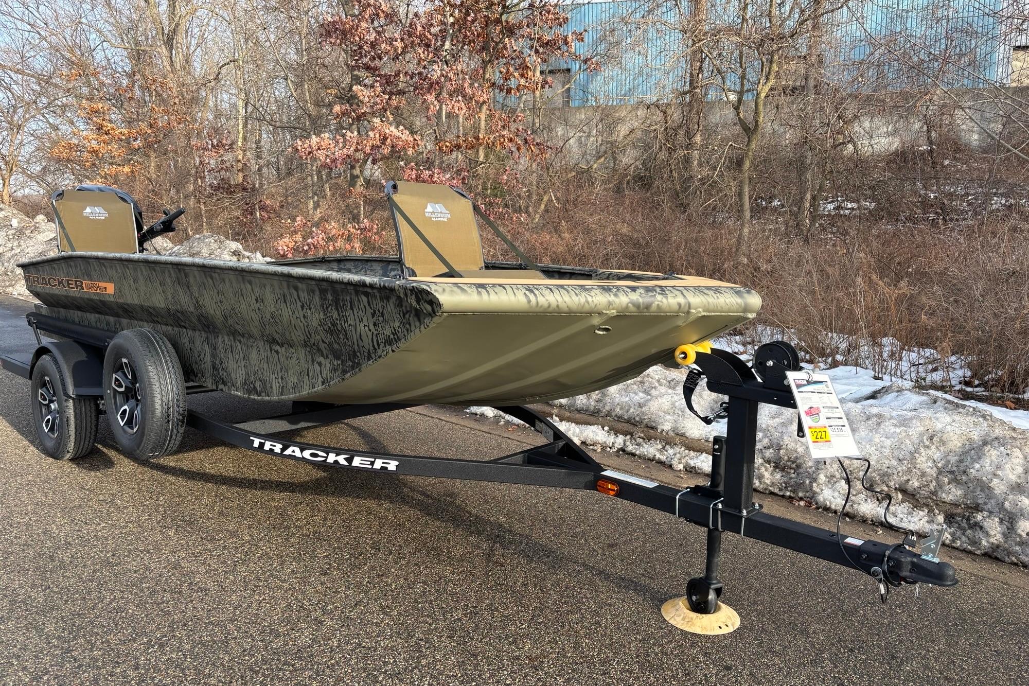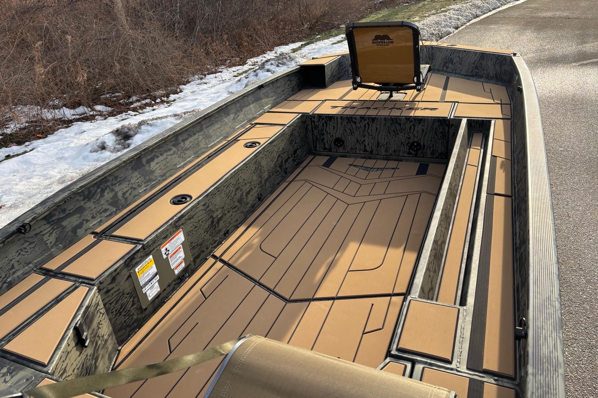 Designed for versatility, it features a spacious front deck ideal for duck hunting, multiple lockable storage compartments, and dry storage in the aft port seat pod. The interior includes Sure Tread™ non-skid flooring for safety and longevity, along with strategically placed tie-down points for gear security. The exclusive VERSATRACK® accessory channel allows customization. Constructed from 100% aluminum with a wood-free transom system, it provides a smooth, dry ride thanks to its 7° deadrise and icebreaker keel. Additional features include integrated spud pole tubes, rear transom steps, and a welded foam-filled interior for strength. Equipped with practical electrical components and a powder-coated trailer, this boat is perfect for die hard waterfowl hunters, and outdoor enthusiasts seeking durability and style in striking Forest Green or TrueTimber® camo patterns.