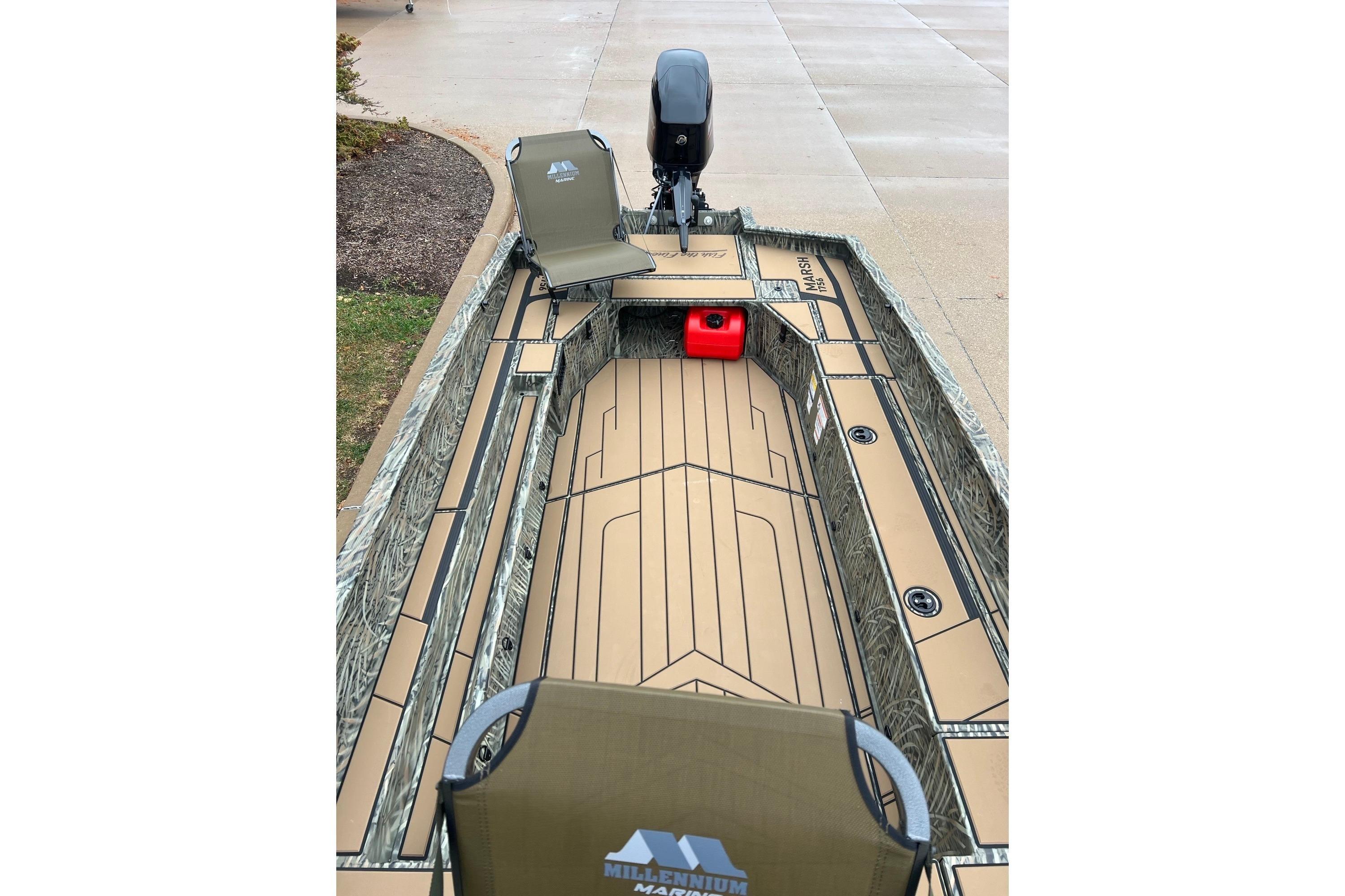 Designed for versatility, it features a spacious front deck ideal for duck hunting, multiple lockable storage compartments, and dry storage in the aft port seat pod. The interior includes Sure Tread™ non-skid flooring for safety and longevity, along with strategically placed tie-down points for gear security. The exclusive VERSATRACK® accessory channel allows customization. Constructed from 100% aluminum with a wood-free transom system, it provides a smooth, dry ride thanks to its 7° deadrise and icebreaker keel. Additional features include integrated spud pole tubes, rear transom steps, and a welded foam-filled interior for strength. Equipped with practical electrical components and a powder-coated trailer, this boat is perfect for die hard waterfowl hunters, and outdoor enthusiasts seeking durability and style in striking Forest Green or TrueTimber® camo patterns.