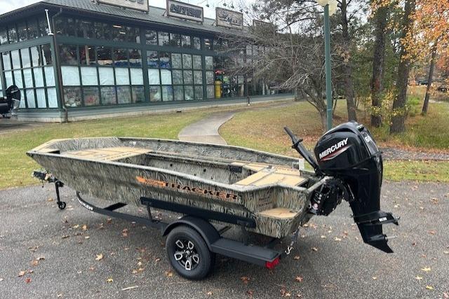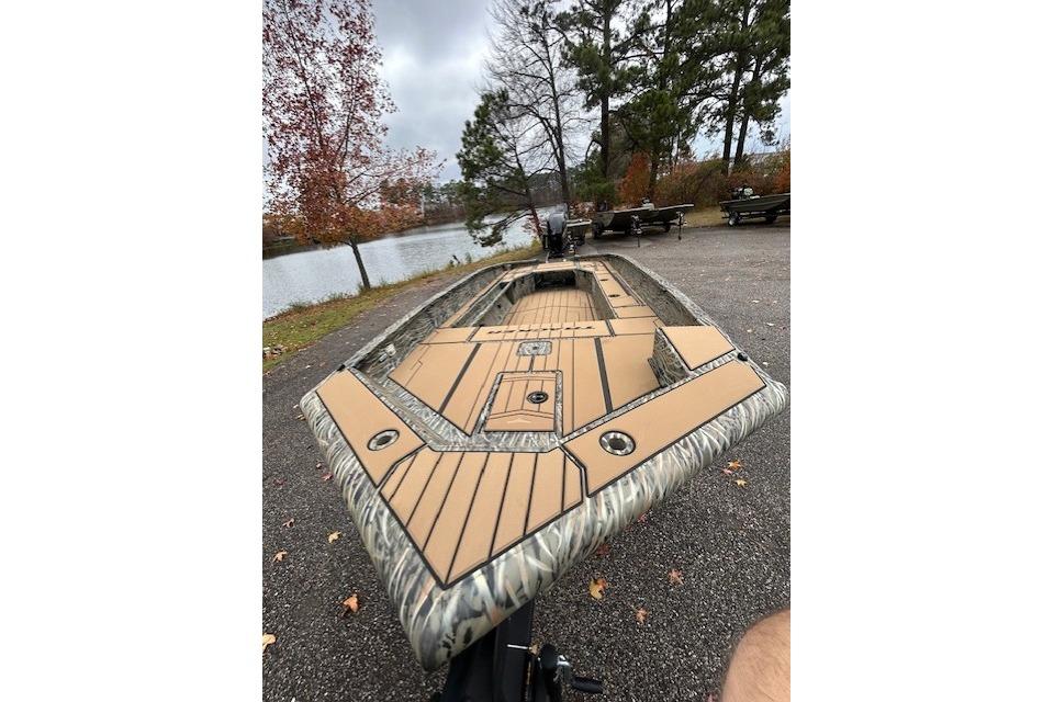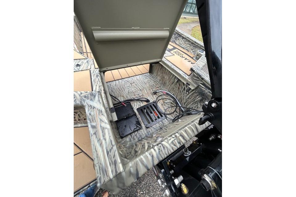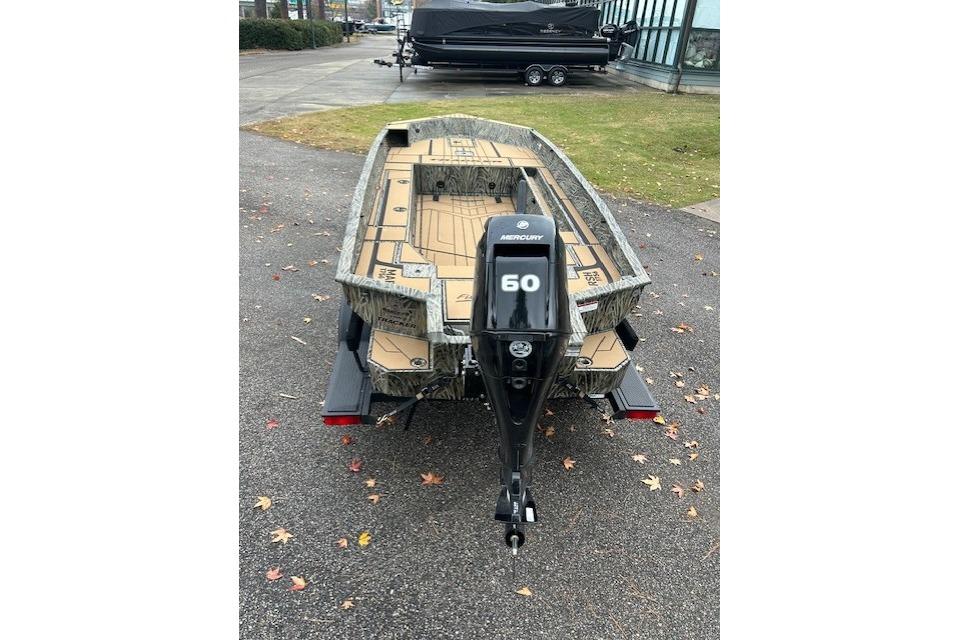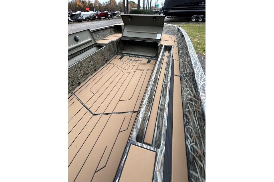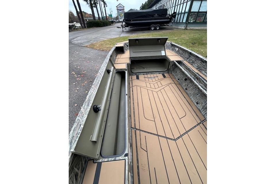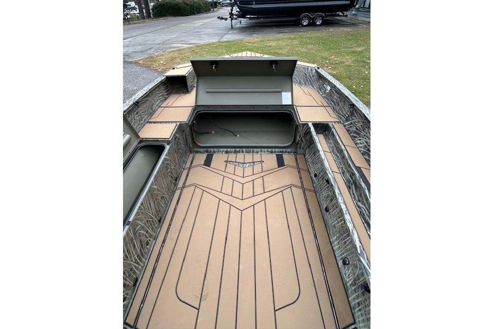 Designed for versatility, it features a spacious front deck ideal for duck hunting, multiple lockable storage compartments, and dry storage in the aft port seat pod. The interior includes Sure Tread™ non-skid flooring for safety and longevity, along with strategically placed tie-down points for gear security. The exclusive VERSATRACK® accessory channel allows customization. Constructed from 100% aluminum with a wood-free transom system, it provides a smooth, dry ride thanks to its 7° deadrise and icebreaker keel. Additional features include integrated spud pole tubes, rear transom steps, and a welded foam-filled interior for strength. Equipped with practical electrical components and a powder-coated trailer, this boat is perfect for die hard waterfowl hunters, and outdoor enthusiasts seeking durability and style in striking Forest Green or TrueTimber® camo patterns.