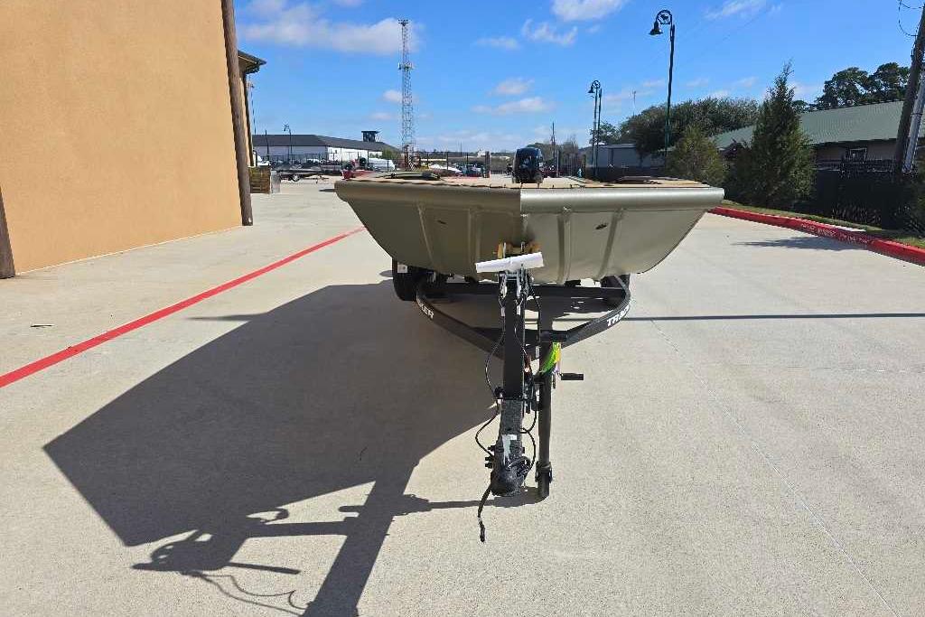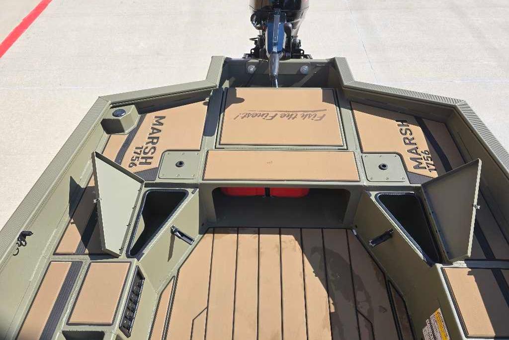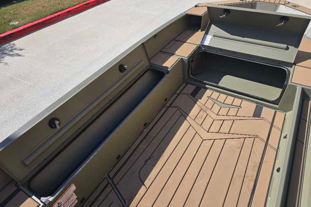Designed for versatility, it features a spacious front deck ideal for duck hunting, multiple lockable storage compartments, and dry storage in the aft port seat pod. The interior includes Sure Tread™ non-skid flooring for safety and longevity, along with strategically placed tie-down points for gear security. The exclusive VERSATRACK® accessory channel allows customization. Constructed from 100% aluminum with a wood-free transom system, it provides a smooth, dry ride thanks to its 7° deadrise and icebreaker keel. Additional features include integrated spud pole tubes, rear transom steps, and a welded foam-filled interior for strength. Equipped with practical electrical components and a powder-coated trailer, this boat is perfect for die hard waterfowl hunters, and outdoor enthusiasts seeking durability and style in striking Forest Green or TrueTimber® camo patterns.