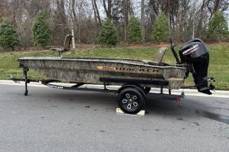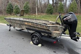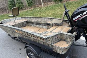 Designed for versatility, it features a spacious front deck ideal for duck hunting, multiple lockable storage compartments, and dry storage in the aft port seat pod. The interior includes Sure Tread™ non-skid flooring for safety and longevity, along with strategically placed tie-down points for gear security. The exclusive VERSATRACK® accessory channel allows customization. Constructed from 100% aluminum with a wood-free transom system, it provides a smooth, dry ride thanks to its 7° deadrise and icebreaker keel. Additional features include integrated spud pole tubes, rear transom steps, and a welded foam-filled interior for strength. Equipped with practical electrical components and a powder-coated trailer, this boat is perfect for die hard waterfowl hunters, and outdoor enthusiasts seeking durability and style in striking Forest Green or TrueTimber® camo patterns.