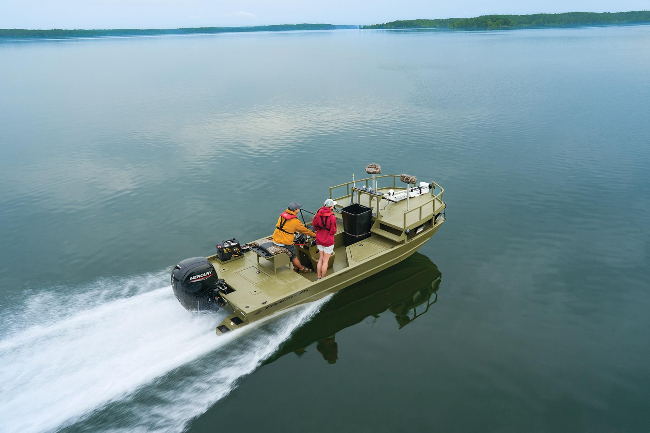 Prepare for an unparalleled bowfishing adventure with the TRACKER® GRIZZLY® 2072 CC Sportsman, a remarkable vessel designed to enhance your targeting accuracy and overall experience on the water. The elevated deck feature positions you at a higher vantage point, allowing for precise targeting with your bow and reducing arrow deflection. To further elevate your bowfishing game, we have equipped this revamped boat with ten super-bright LEDs, illuminating your quarry with an impressive 100,000 lumens both inside and outside the vessel. Experience enhanced user-friendliness with a leaning post and storage compartments, ensuring that every aspect of your bowfishing excursion is optimized for convenience and enjoyment. The 100% aluminum construction of the GRIZZLY 2072 CC Sportsman, featuring a .100 hull and .190 floor, guarantees long-term durability and reliability. The all-welded hull, stringer, transom, and decks contribute to the boat's robust structure, capable of withstanding years of use in various conditions. Backed by the reputable TRACKER PROMISE, which offers the best factory warranty in the domain of aluminum boats, the GRIZZLY 2072 CC Sportsman provides you with the assurance and peace of mind needed for your bowfishing expeditions. For those seeking to enhance the visual appeal and camouflage capabilities of their bowfishing vessel, optional TrueTimber camo patterns are available to personalize your TRACKER® GRIZZLY® 2072 CC Sportsman. These innovative camo designs not only add a touch of flair to your boat but also allow you to seamlessly blend into your surroundings, maximizing your hunting success on the water. Elevate your bowfishing experience to new heights with the unmatched features, durability, and warranty offered by the TRACKER GRIZZLY 2072 CC Sportsman.