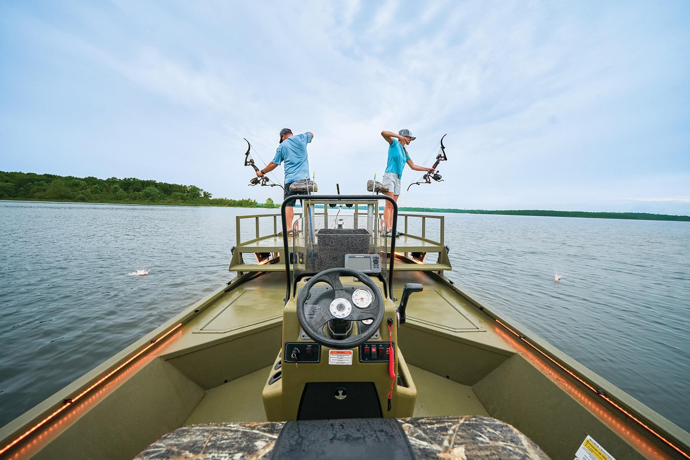 • Removable & elevated bow shooting deck w/trim switch, railing, rail-mounted utility tray w/arrow, tool & drink holders, 2 pedestal seat base locations & 160W Outrigger Outdoors® bowfishing lights