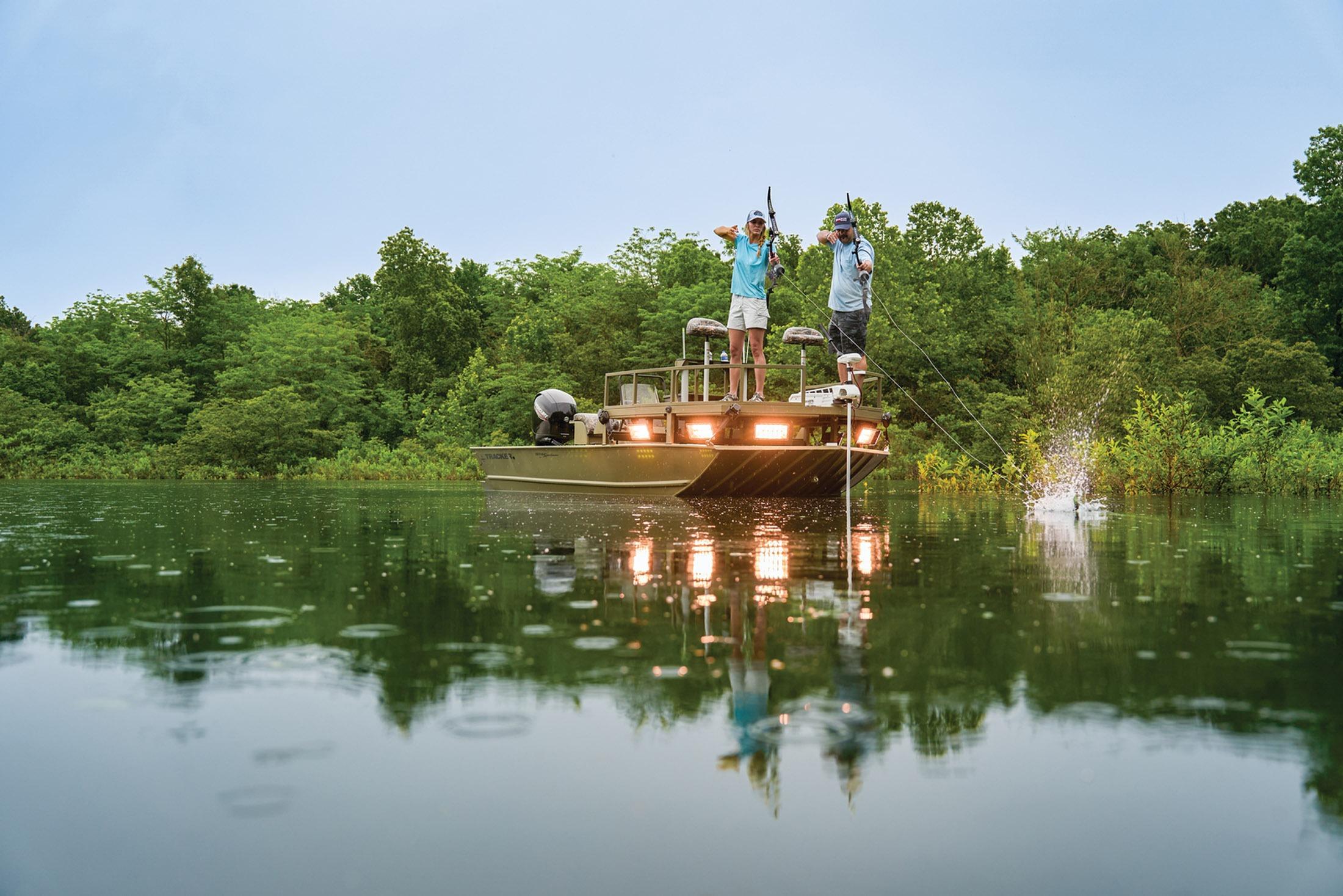 • Six 160W Outrigger Outdoors® Swamp Eye® HD bowfishing lights gradually adjust an improved output of 24,000+ lumens from warm white to cool white to increase visibility in clear or muddy water, w/building block wiring harness & control dial