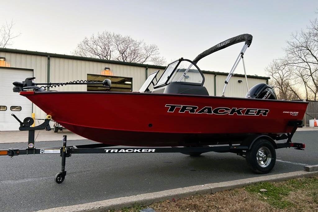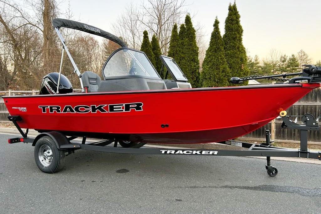 The TRACKER PRO GUIDE V-16 WT packs a punch in a compact, Deep V hull design. The walk-thru windshield shields you from the elements, ensuring comfort in all conditions. With three fishing seats and six customizable setups, the PRO GUIDE V-16 WT is ready for your whole crew. The Deep V hull is designed for smooth, dry performance and peak edge-to-edge stability. It has space galore, so you can haul all your gear with ease. Up front is a standard Minn Kota trolling motor with a livewell/baitwell and twin storage boxes while the console features a Garmin Striker 4 color fishfinder with a full gauge setup and smooth, reliable steering. Rounding out the package are a custom-fitted trailer and reliable, economical four stroke Mercury power.