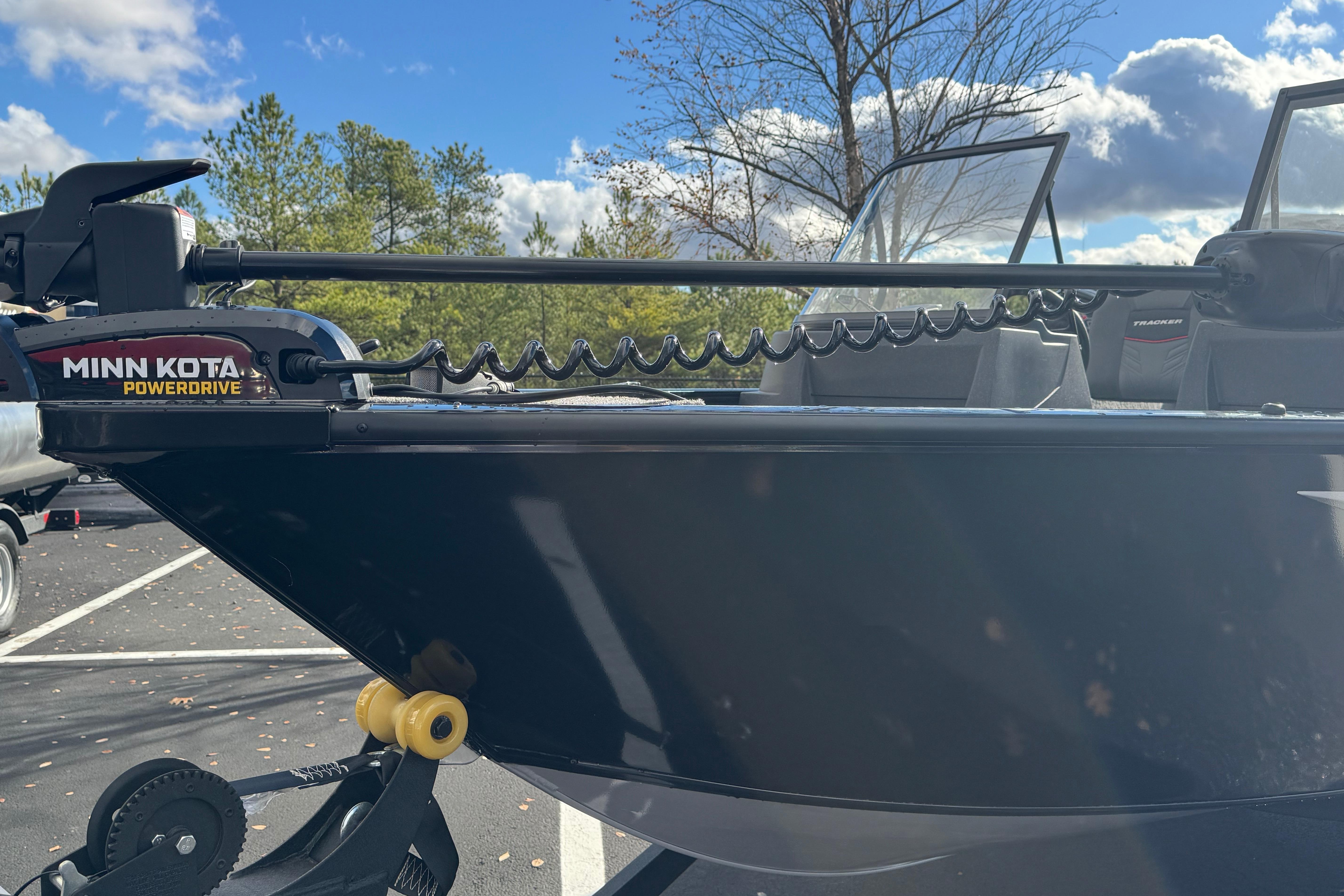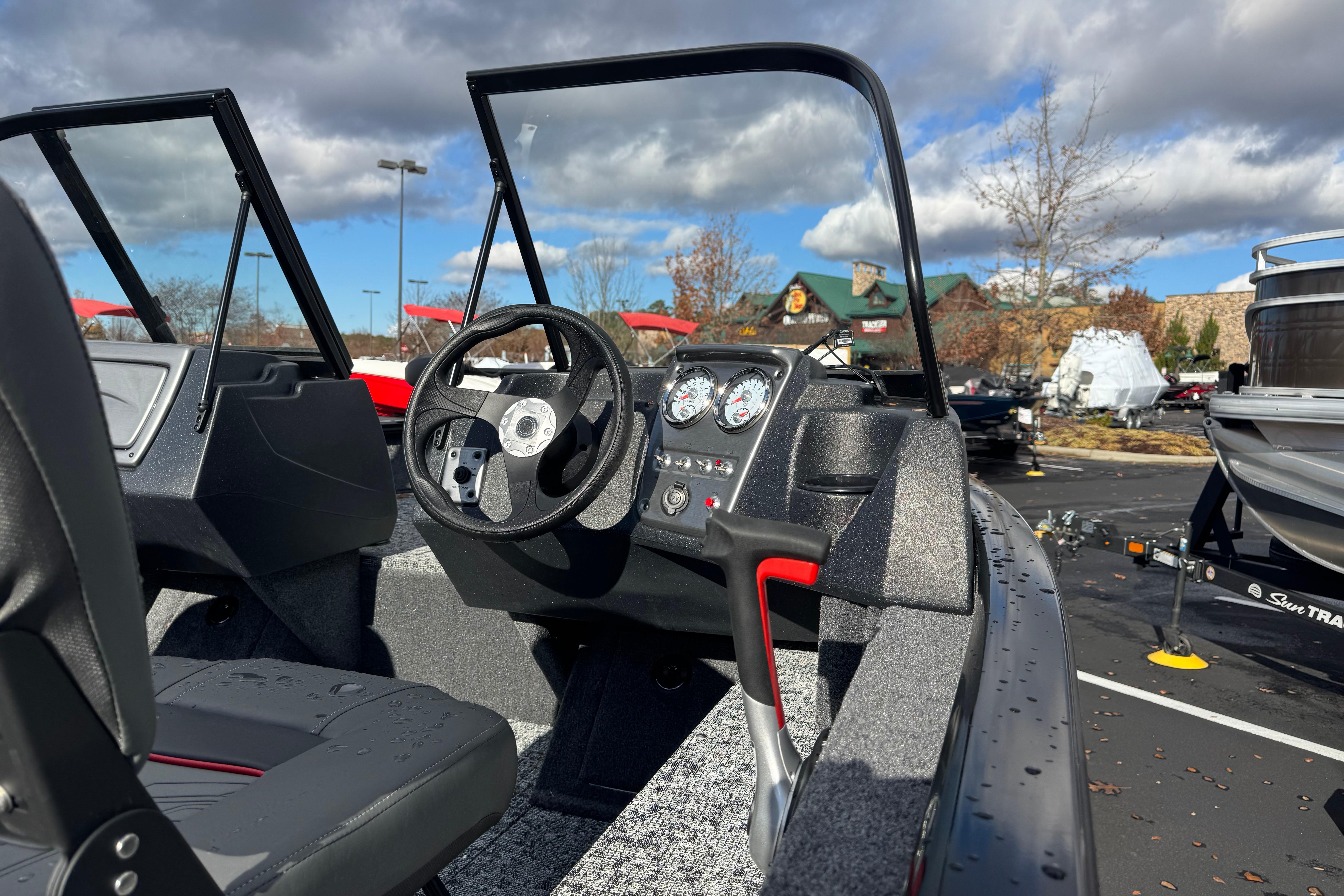 The TRACKER PRO GUIDE V-16 WT packs a punch in a compact, Deep V hull design. The walk-thru windshield shields you from the elements, ensuring comfort in all conditions. With three fishing seats and six customizable setups, the PRO GUIDE V-16 WT is ready for your whole crew. The Deep V hull is designed for smooth, dry performance and peak edge-to-edge stability. It has space galore, so you can haul all your gear with ease. Up front is a standard Minn Kota trolling motor with a livewell/baitwell and twin storage boxes while the console features a Garmin Striker 4 color fishfinder with a full gauge setup and smooth, reliable steering. Rounding out the package are a custom-fitted trailer and reliable, economical four stroke Mercury power.