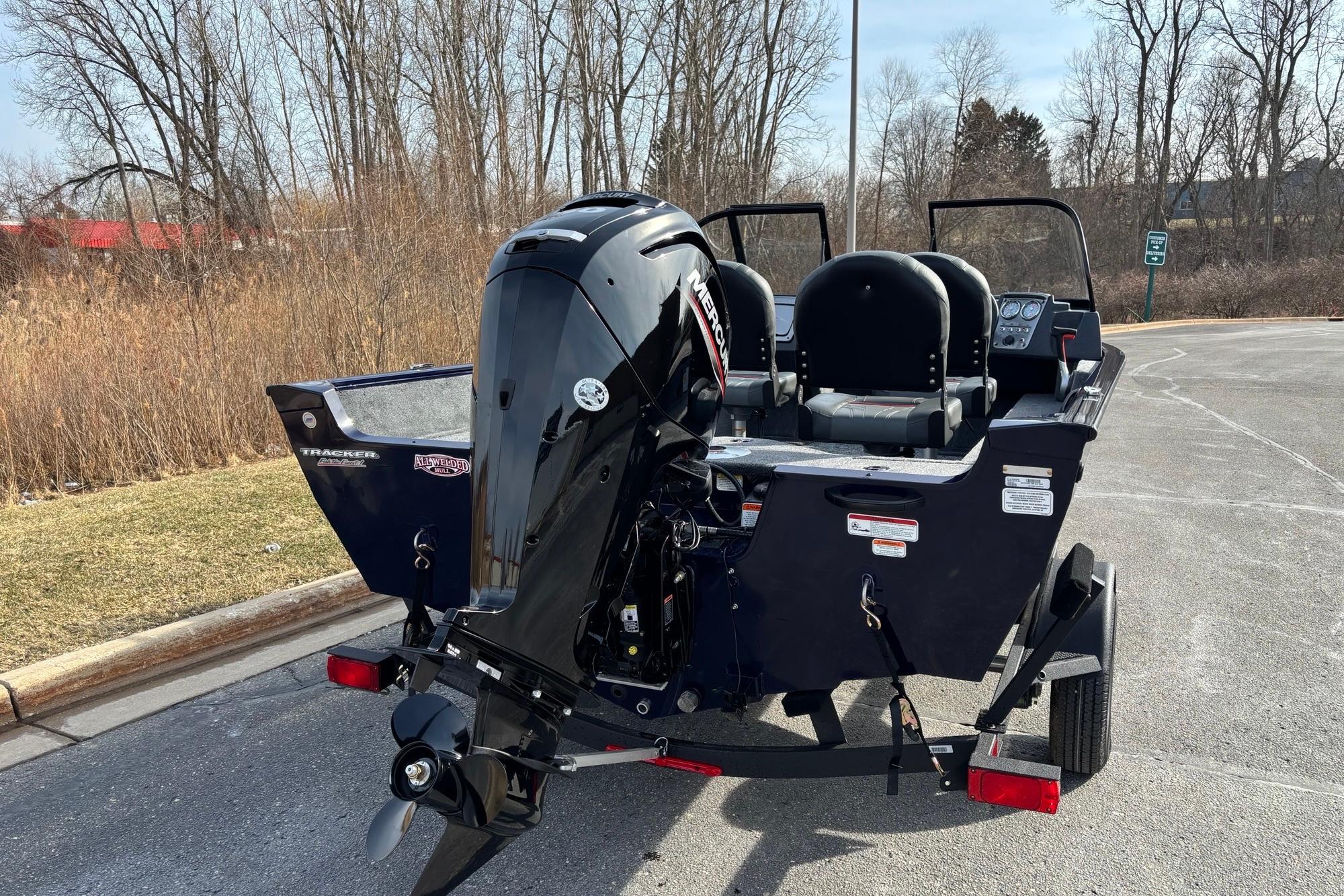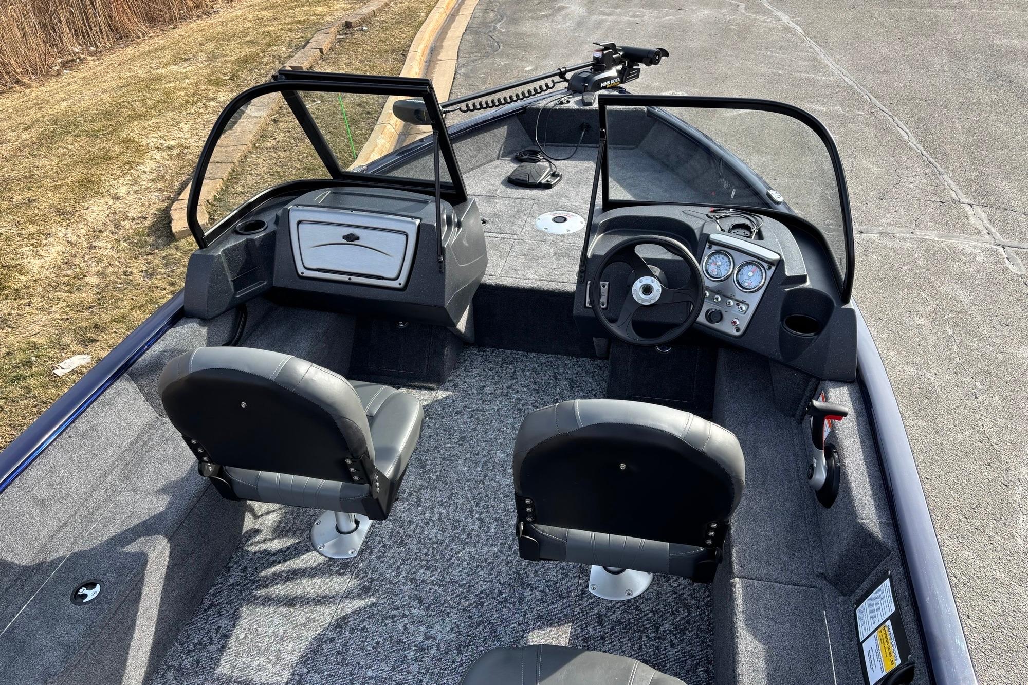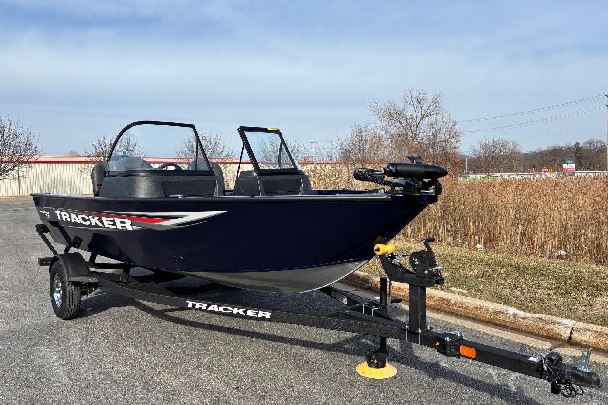 The TRACKER PRO GUIDE V-16 WT packs a punch in a compact, Deep V hull design. The walk-thru windshield shields you from the elements, ensuring comfort in all conditions. With three fishing seats and six customizable setups, the PRO GUIDE V-16 WT is ready for your whole crew. The Deep V hull is designed for smooth, dry performance and peak edge-to-edge stability. It has space galore, so you can haul all your gear with ease. Up front is a standard Minn Kota trolling motor with a livewell/baitwell and twin storage boxes while the console features a Garmin Striker 4 color fishfinder with a full gauge setup and smooth, reliable steering. Rounding out the package are a custom-fitted trailer and reliable, economical four stroke Mercury power.