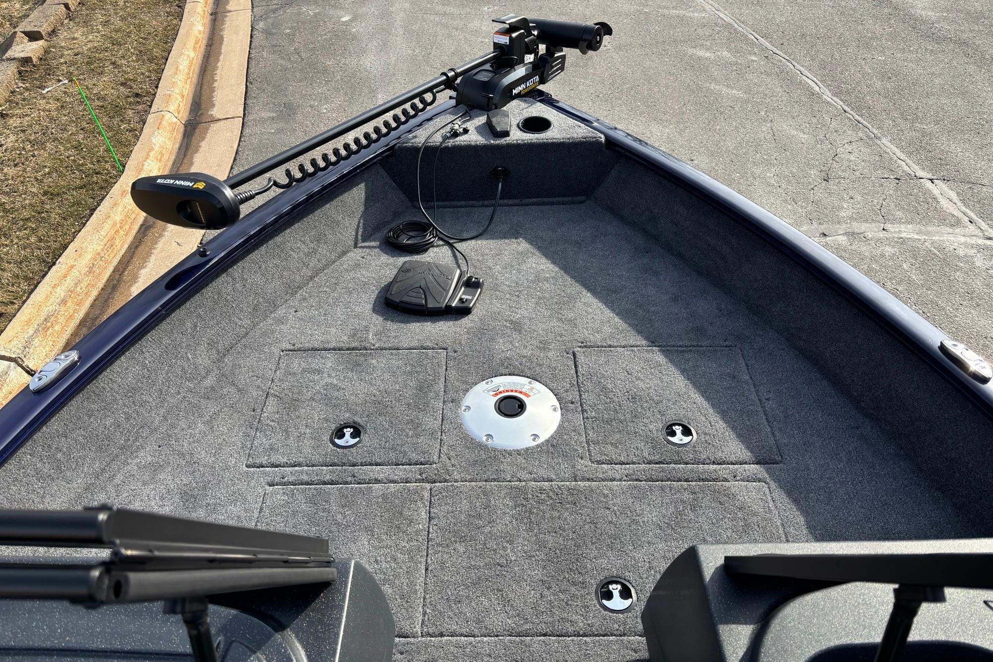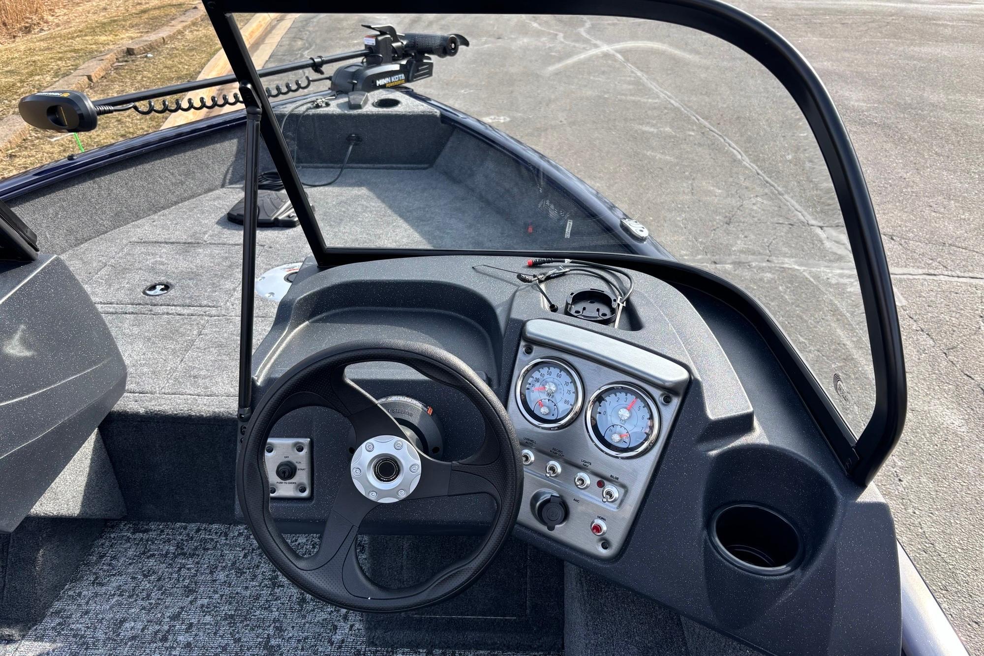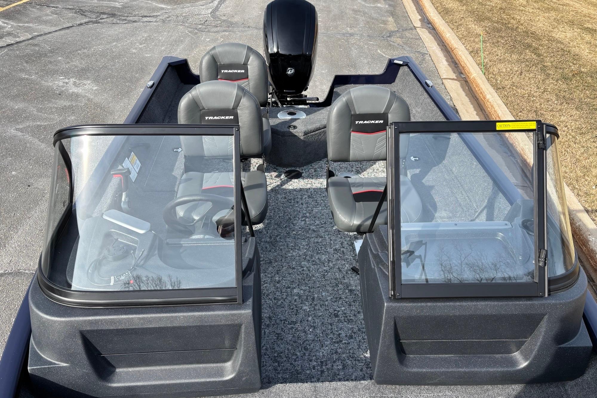 The TRACKER PRO GUIDE V-16 WT packs a punch in a compact, Deep V hull design. The walk-thru windshield shields you from the elements, ensuring comfort in all conditions. With three fishing seats and six customizable setups, the PRO GUIDE V-16 WT is ready for your whole crew. The Deep V hull is designed for smooth, dry performance and peak edge-to-edge stability. It has space galore, so you can haul all your gear with ease. Up front is a standard Minn Kota trolling motor with a livewell/baitwell and twin storage boxes while the console features a Garmin Striker 4 color fishfinder with a full gauge setup and smooth, reliable steering. Rounding out the package are a custom-fitted trailer and reliable, economical four stroke Mercury power.