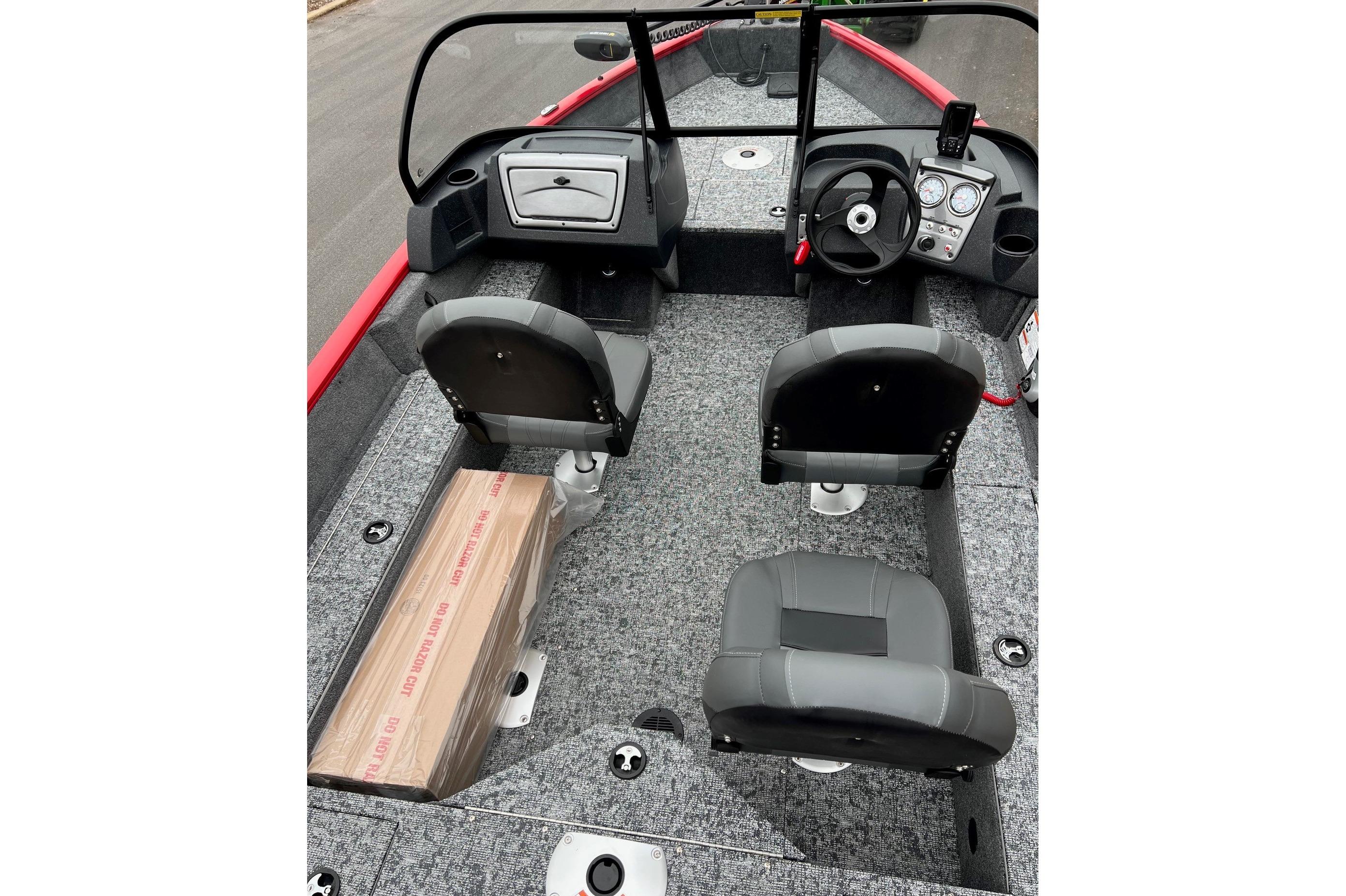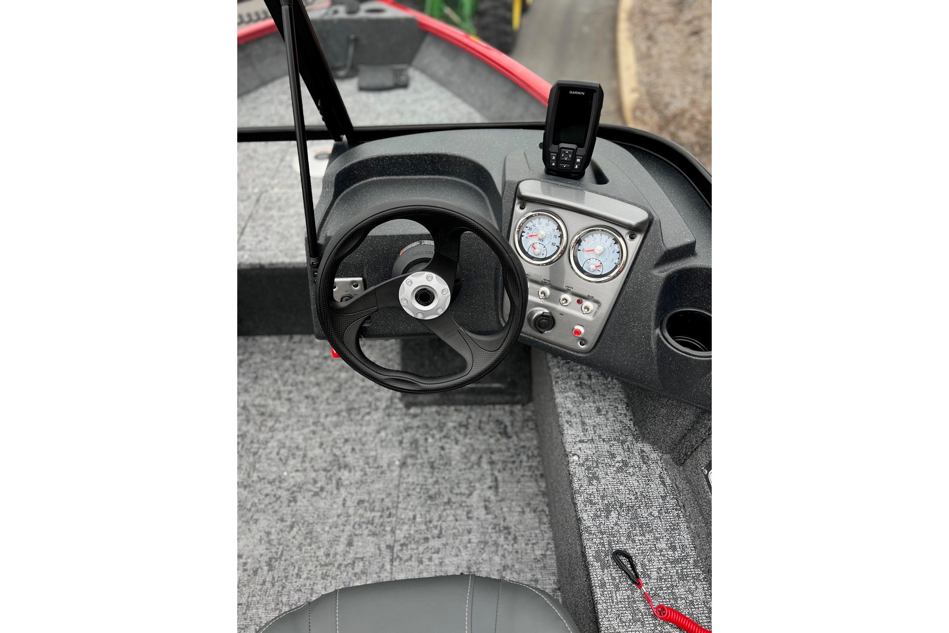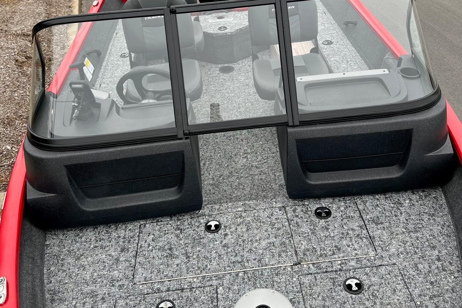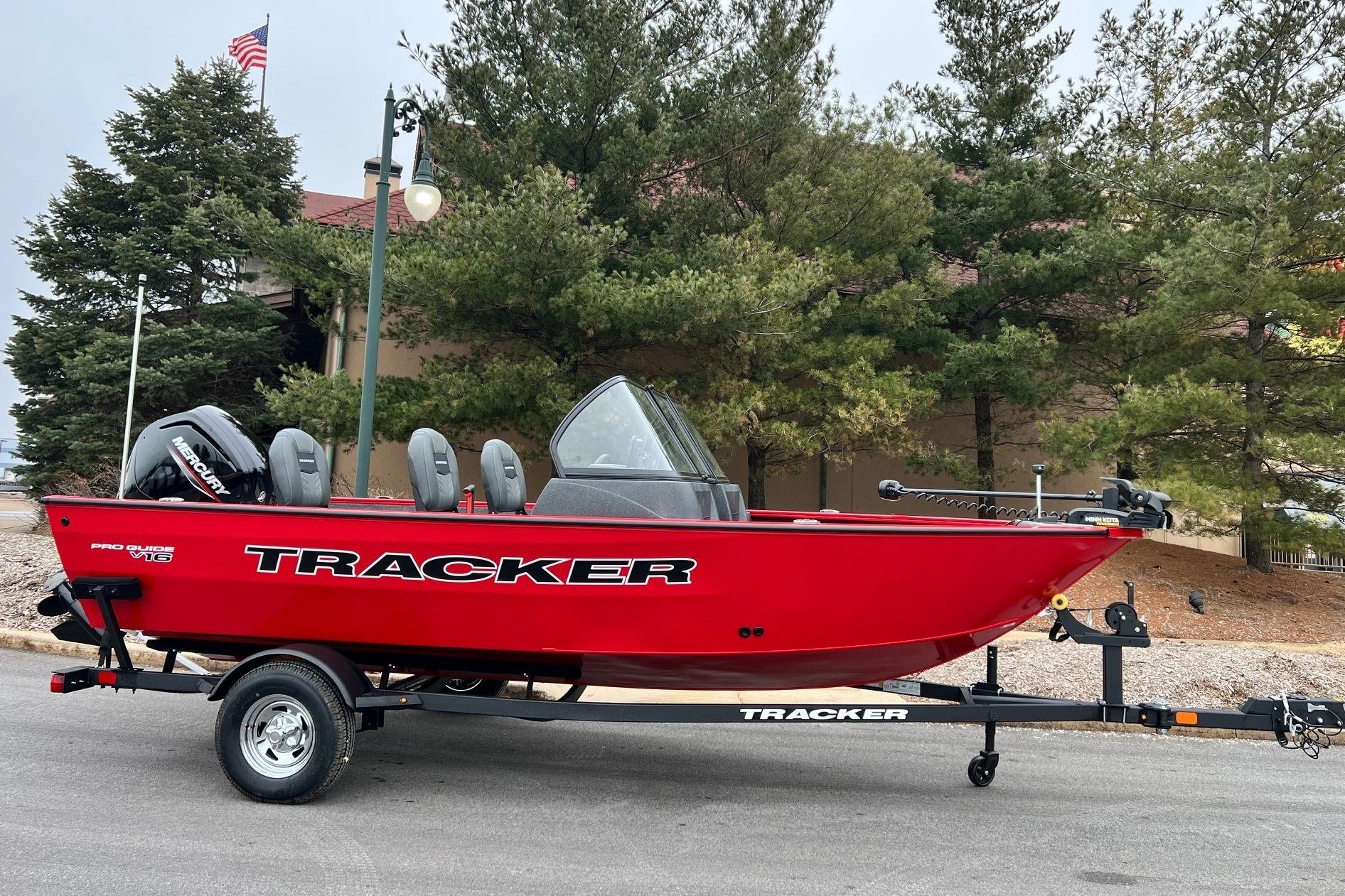 The TRACKER PRO GUIDE V-16 WT packs a punch in a compact, Deep V hull design. The walk-thru windshield shields you from the elements, ensuring comfort in all conditions. With three fishing seats and six customizable setups, the PRO GUIDE V-16 WT is ready for your whole crew. The Deep V hull is designed for smooth, dry performance and peak edge-to-edge stability. It has space galore, so you can haul all your gear with ease. Up front is a standard Minn Kota trolling motor with a livewell/baitwell and twin storage boxes while the console features a Garmin Striker 4 color fishfinder with a full gauge setup and smooth, reliable steering. Rounding out the package are a custom-fitted trailer and reliable, economical four stroke Mercury power.