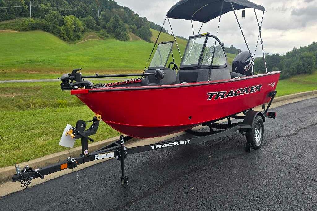 The TRACKER PRO GUIDE V-16 WT packs a punch in a compact, Deep V hull design. The walk-thru windshield shields you from the elements, ensuring comfort in all conditions. With three fishing seats and six customizable setups, the PRO GUIDE V-16 WT is ready for your whole crew. The Deep V hull is designed for smooth, dry performance and peak edge-to-edge stability. It has space galore, so you can haul all your gear with ease. Up front is a standard Minn Kota trolling motor with a livewell/baitwell and twin storage boxes while the console features a Garmin Striker 4 color fishfinder with a full gauge setup and smooth, reliable steering. Rounding out the package are a custom-fitted trailer and reliable, economical four stroke Mercury power.