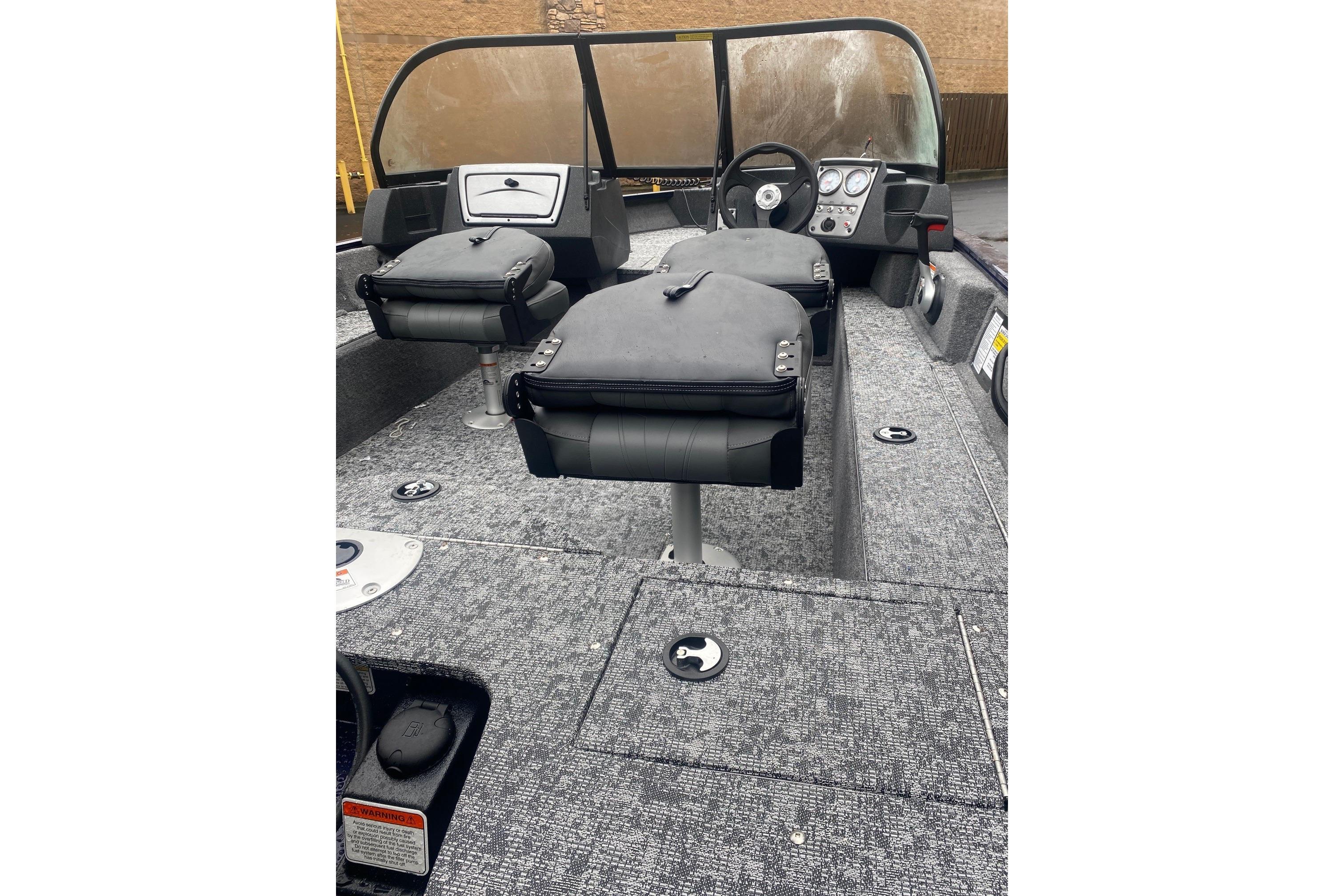 The TRACKER PRO GUIDE V-16 WT packs a punch in a compact, Deep V hull design. The walk-thru windshield shields you from the elements, ensuring comfort in all conditions. With three fishing seats and six customizable setups, the PRO GUIDE V-16 WT is ready for your whole crew. The Deep V hull is designed for smooth, dry performance and peak edge-to-edge stability. It has space galore, so you can haul all your gear with ease. Up front is a standard Minn Kota trolling motor with a livewell/baitwell and twin storage boxes while the console features a Garmin Striker 4 color fishfinder with a full gauge setup and smooth, reliable steering. Rounding out the package are a custom-fitted trailer and reliable, economical four stroke Mercury power.