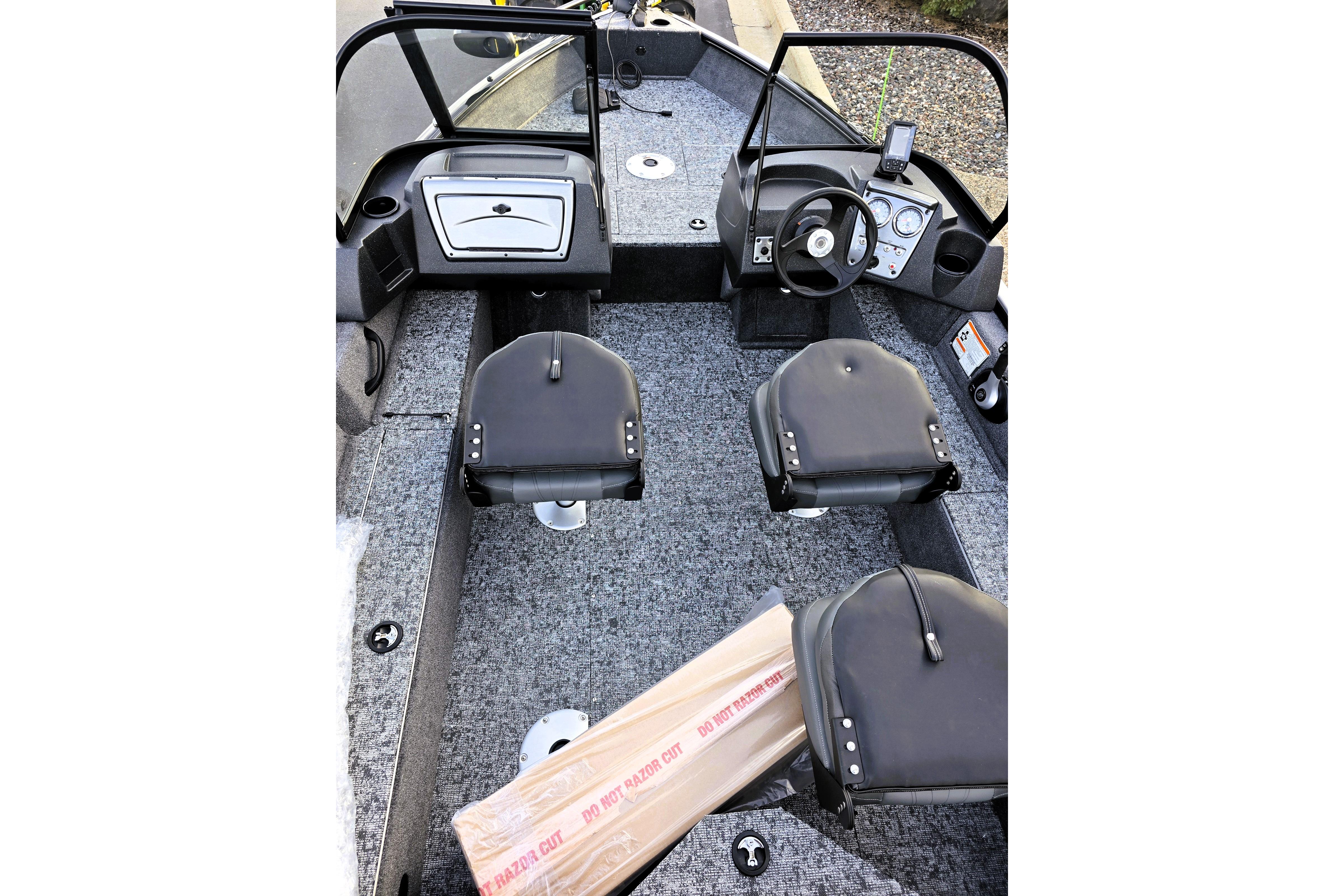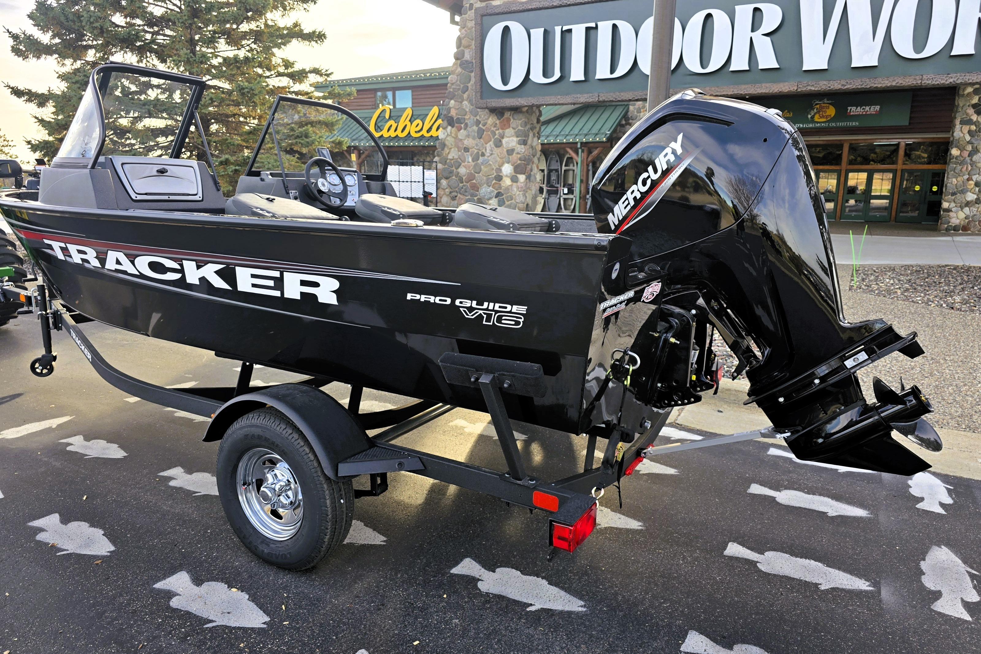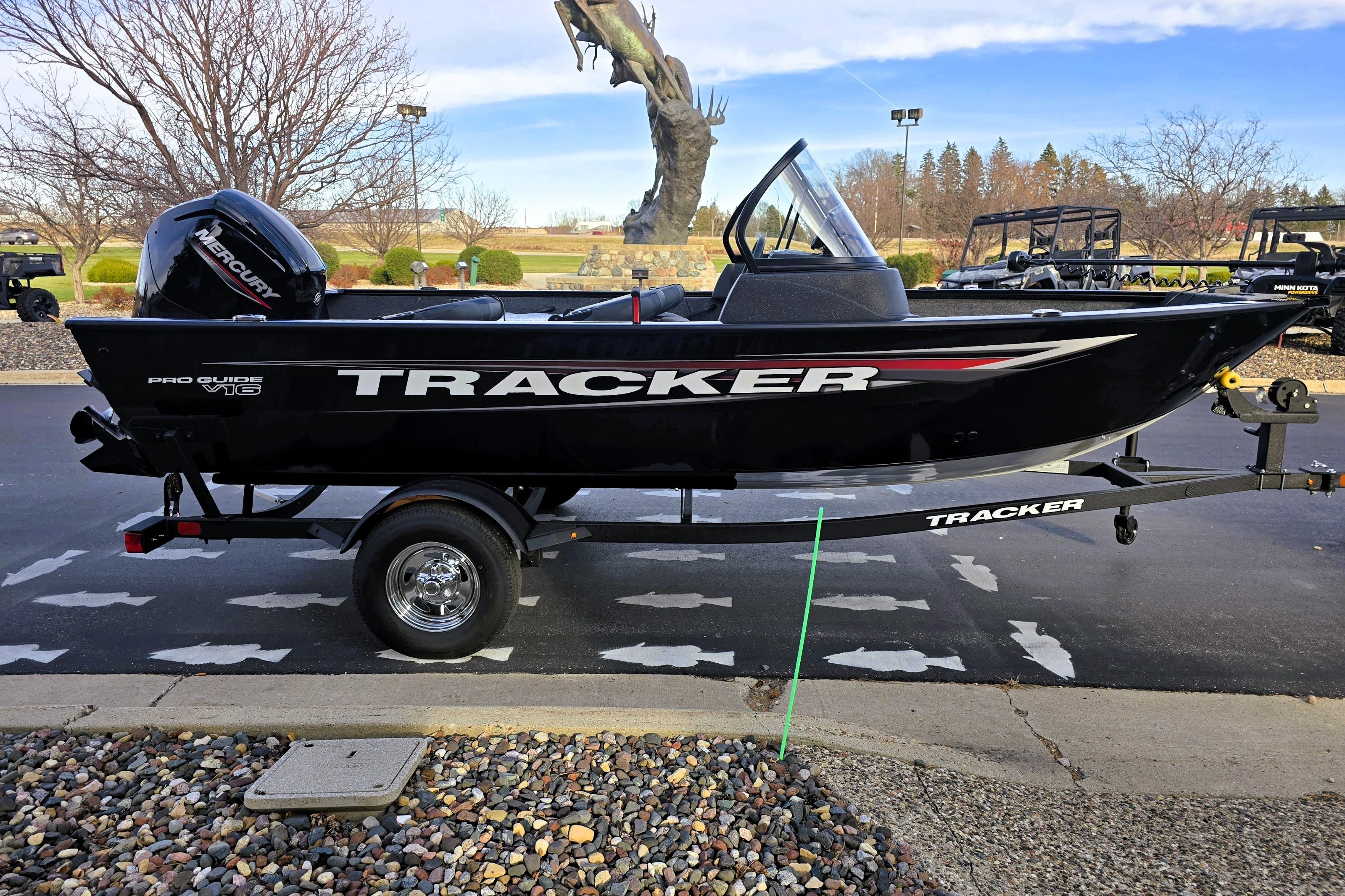 The TRACKER PRO GUIDE V-16 WT packs a punch in a compact, Deep V hull design. The walk-thru windshield shields you from the elements, ensuring comfort in all conditions. With three fishing seats and six customizable setups, the PRO GUIDE V-16 WT is ready for your whole crew. The Deep V hull is designed for smooth, dry performance and peak edge-to-edge stability. It has space galore, so you can haul all your gear with ease. Up front is a standard Minn Kota trolling motor with a livewell/baitwell and twin storage boxes while the console features a Garmin Striker 4 color fishfinder with a full gauge setup and smooth, reliable steering. Rounding out the package are a custom-fitted trailer and reliable, economical four stroke Mercury power.