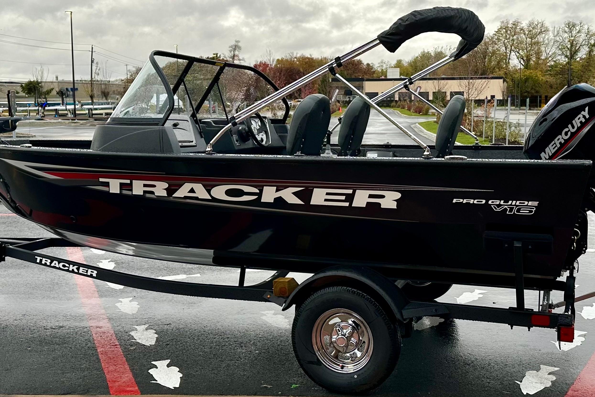 The TRACKER PRO GUIDE V-16 WT packs a punch in a compact, Deep V hull design. The walk-thru windshield shields you from the elements, ensuring comfort in all conditions. With three fishing seats and six customizable setups, the PRO GUIDE V-16 WT is ready for your whole crew. The Deep V hull is designed for smooth, dry performance and peak edge-to-edge stability. It has space galore, so you can haul all your gear with ease. Up front is a standard Minn Kota trolling motor with a livewell/baitwell and twin storage boxes while the console features a Garmin Striker 4 color fishfinder with a full gauge setup and smooth, reliable steering. Rounding out the package are a custom-fitted trailer and reliable, economical four stroke Mercury power.