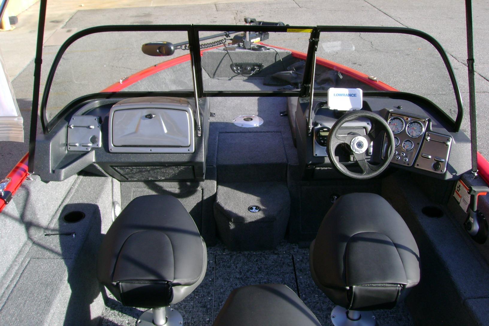• Port & starboard rotomolded consoles w/tempered safety-glass walk-thru windshields & hatch
