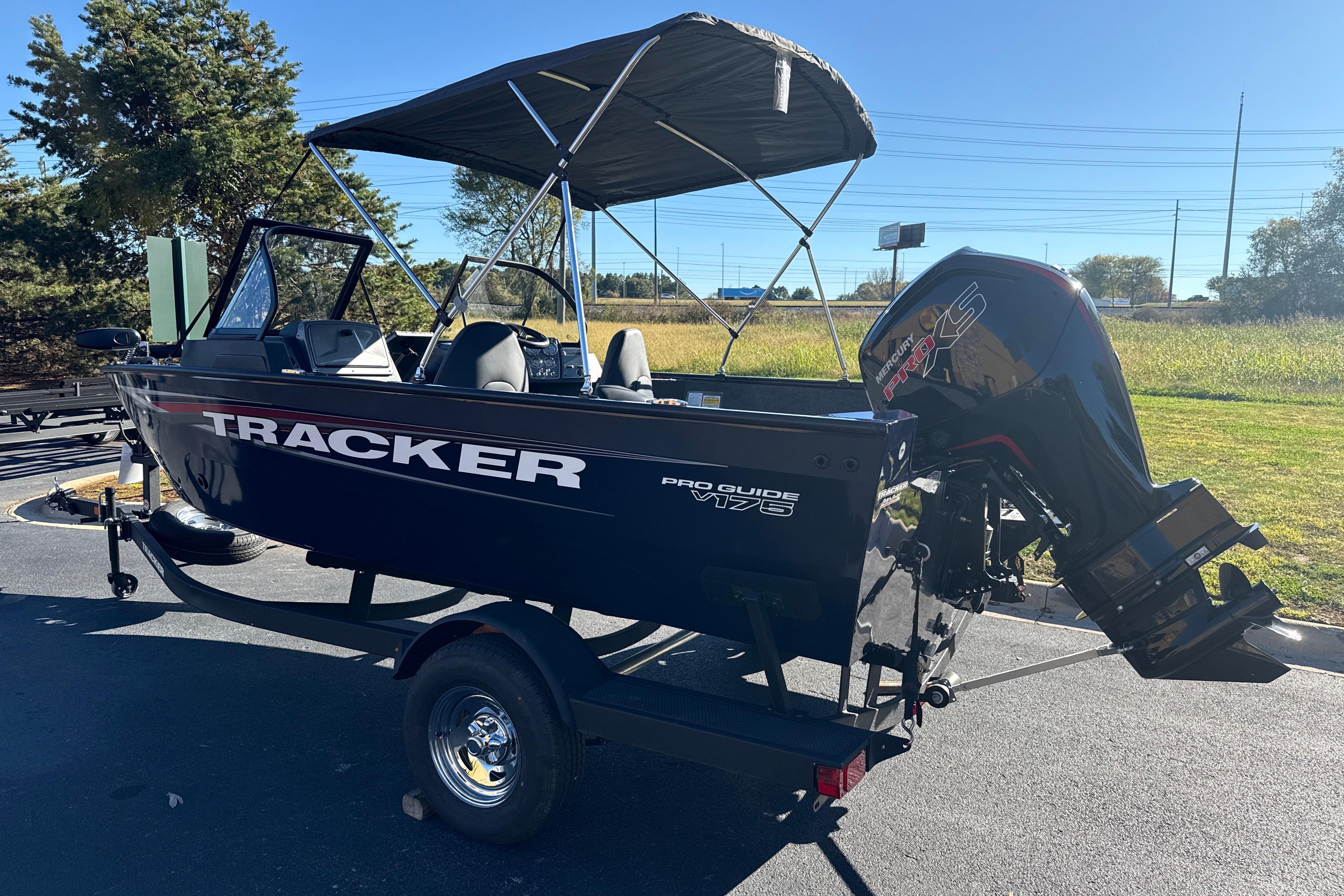 Whether the day calls for fishing, tubing, skiing, cruising or all of the above, the TRACKER PRO GUIDE™ V-175 Combo delivers the versatility and amenities to make it happen. Measuring 17’ 7” in length and 8’ 1” in width, the V-175 Combo has exceptional stability for cruising and casting. Storage is perfect for rods and tackle or watersports gear. A growling Mercury® FourStroke engine has the pep to knock down rollers and pop up a wakeboarder with ease. The back deck serves are a solid casting platform when down, and when up adds a pair of seats covered in premium marine-grade vinyl. The console is shrouded by a wraparound walk-thru windshield and carries a full complement of gauges, a fishfinder, and easy, responsive steering. Whether you're a seasoned angler or a family looking for a versatile watercraft, the TRACKER PRO GUIDE™ V-175 Combo delivers on both performance and comfort, making it a popular choice among all water lovers.