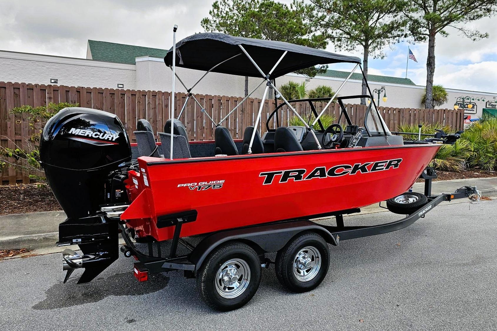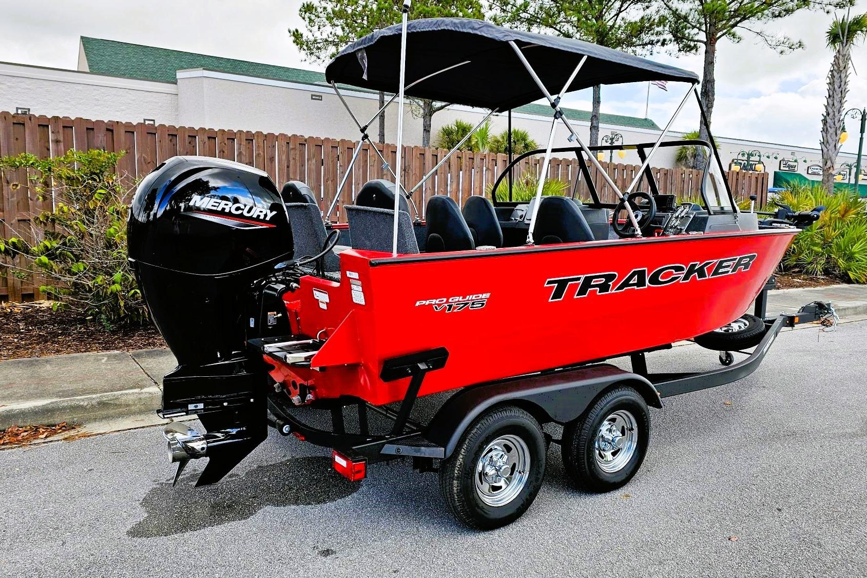 Whether the day calls for fishing, tubing, skiing, cruising or all of the above, the TRACKER PRO GUIDE™ V-175 Combo delivers the versatility and amenities to make it happen. Measuring 17’ 7” in length and 8’ 1” in width, the V-175 Combo has exceptional stability for cruising and casting. Storage is perfect for rods and tackle or watersports gear. A growling Mercury® FourStroke engine has the pep to knock down rollers and pop up a wakeboarder with ease. The back deck serves are a solid casting platform when down, and when up adds a pair of seats covered in premium marine-grade vinyl. The console is shrouded by a wraparound walk-thru windshield and carries a full complement of gauges, a fishfinder, and easy, responsive steering. Whether you're a seasoned angler or a family looking for a versatile watercraft, the TRACKER PRO GUIDE™ V-175 Combo delivers on both performance and comfort, making it a popular choice among all water lovers.