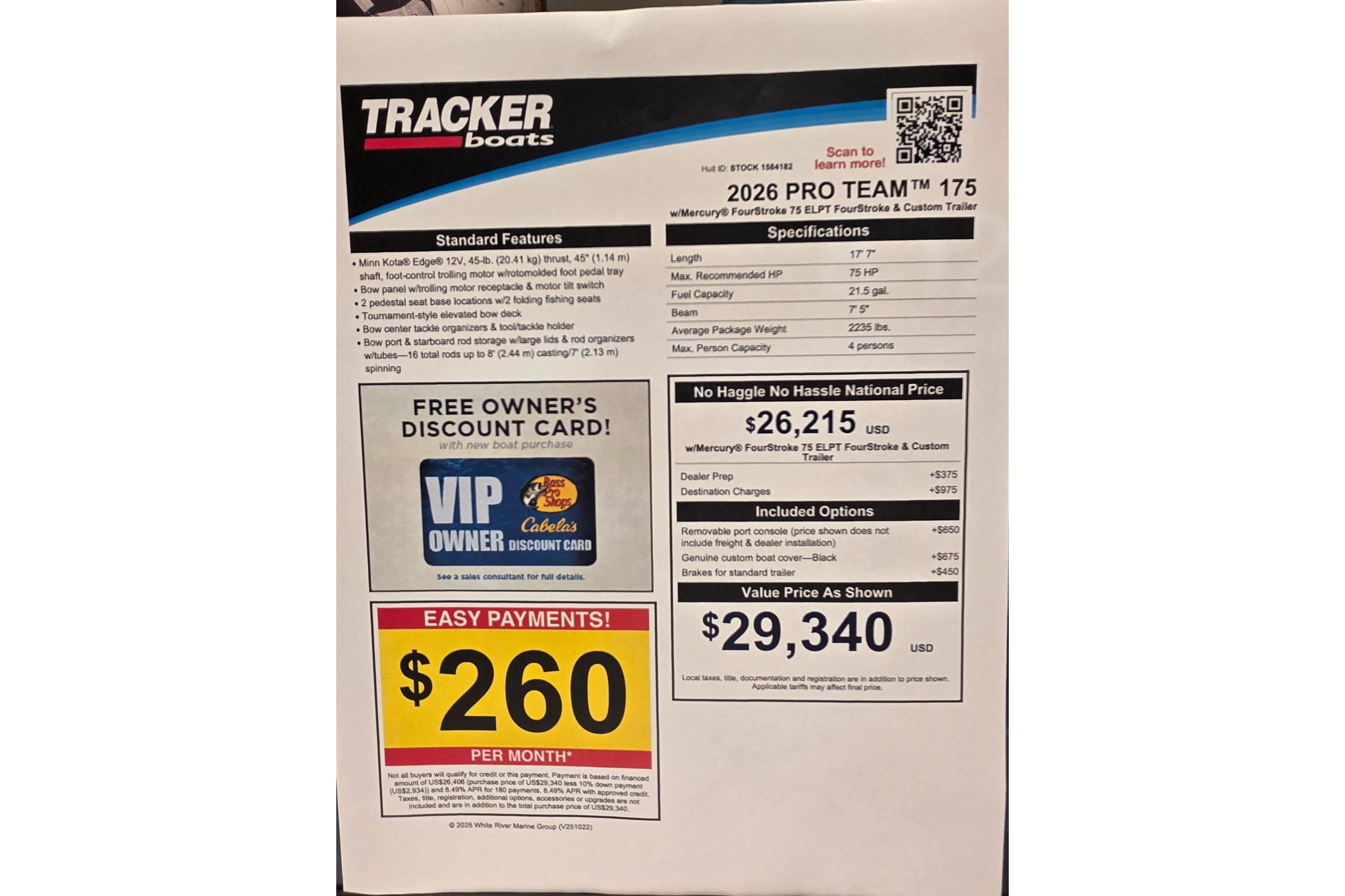 The TRACKER PRO TEAM 175® is one of the most value- and feature-packed boats in the TRACKER stable, and also one of our most popular models. All-welded construction offers superior strength that carries huge decks, abundant storage, and a 21-gallon aerated, divided, and timed livewell. Motivation comes by way of reliable, economical Mercury® power designed for years of exciting performance. The cosole features a TRACKER touchscreen display that keeps an eye on your outboard and more, a Lowrance Hook color fishfinder, and sturdy, responsive steering. With a proven legacy and untold scores of fish caught, the TRACKER PRO TEAM™ 175 delivers tournament-ready fishability and performance with unbeatable value.