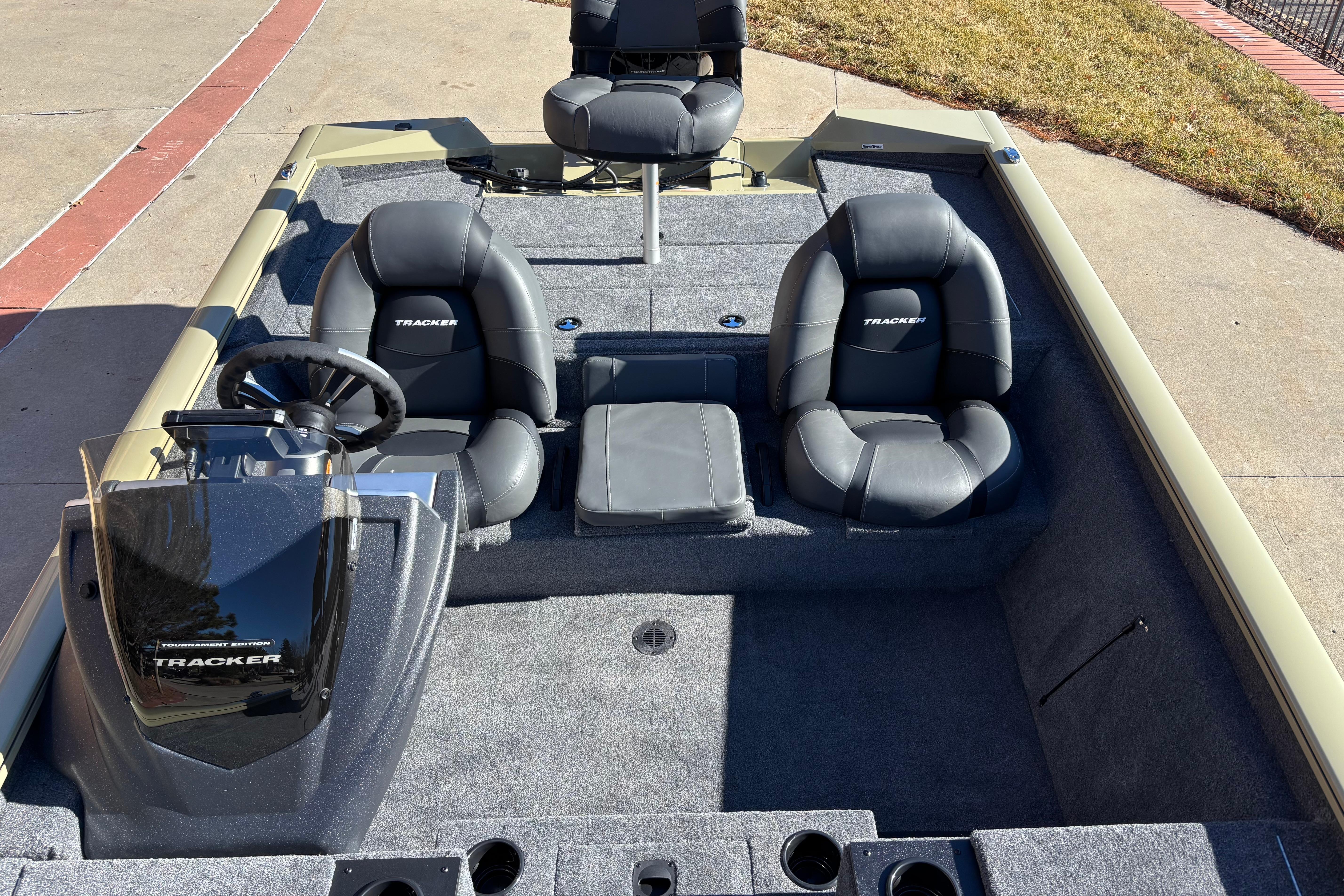• 8 drink holders—2 on bow deck, 2 in bow tackle storage, 2 on step cooler & 2 floor mounted