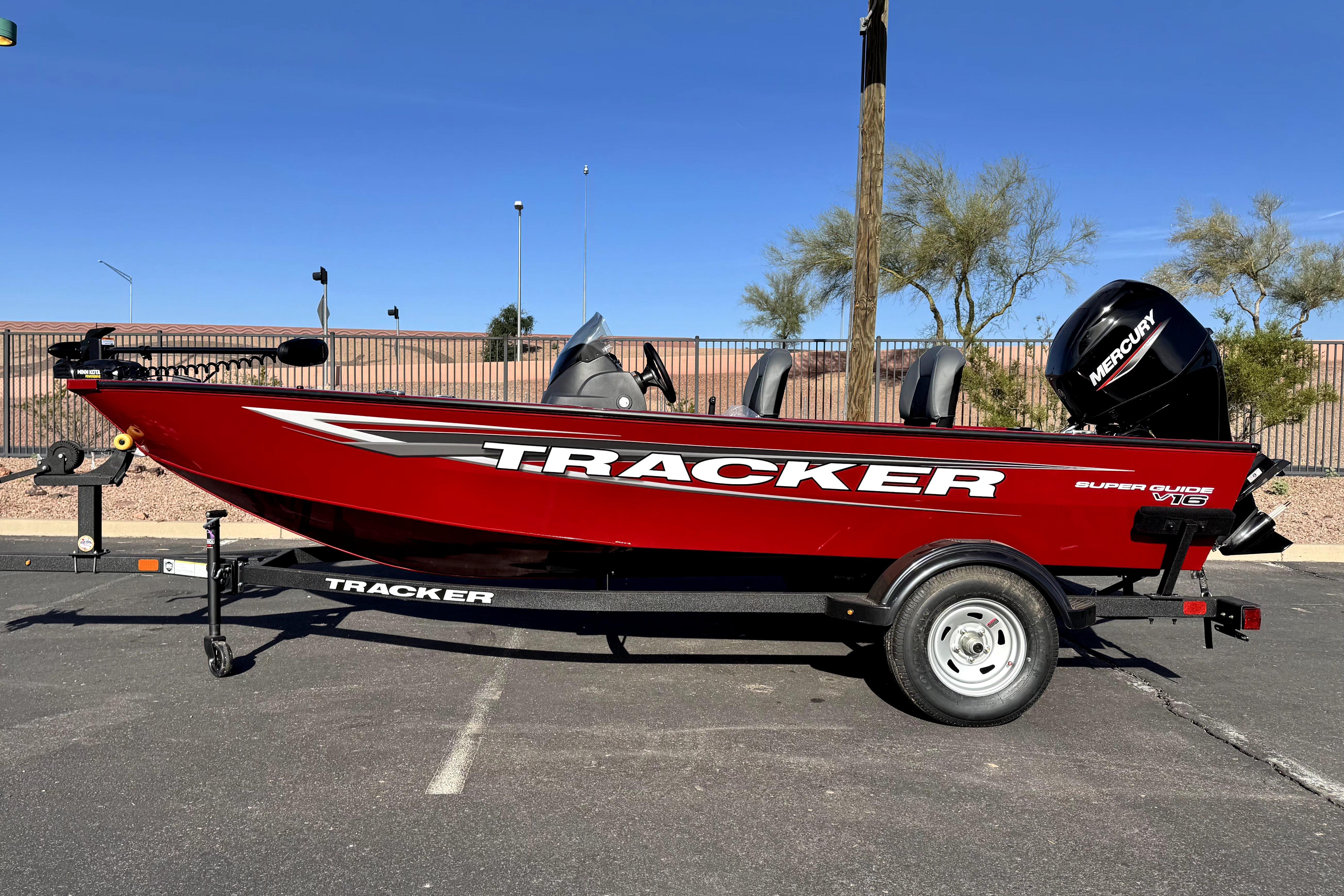The TRACKER SUPER GUIDE V-16 SC is brimming with features, value, and space. The side console design optimizes space and storage to give a bigger presence. The all-welded hull is robotically welded for maximum strength and precision, giving you peace of mind when the swells kick up. Multiple seating locations let you tailor the interior for the day at hand, and comfort comes by way of our legendary handmade folding fishing seats. This V-16 SC comes standard with a powerful and efficient Mercury FourStroke outboard engine and a custom-matched GALVASHIELD Impact trailer for smooth, safe transportation. And with the TRACKER PROMISE backing it up, you can enjoy peace of mind knowing you have the best factory warranty in aluminum boats.