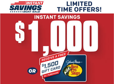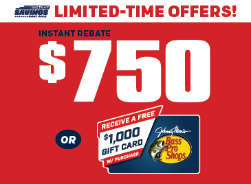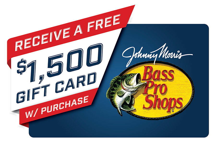 For a limited time, save up to $1,000 OR receive a FREE Bass Pro Shops Gift Card up to $1,500 with purchase of select new 2025 TRACKER boats.